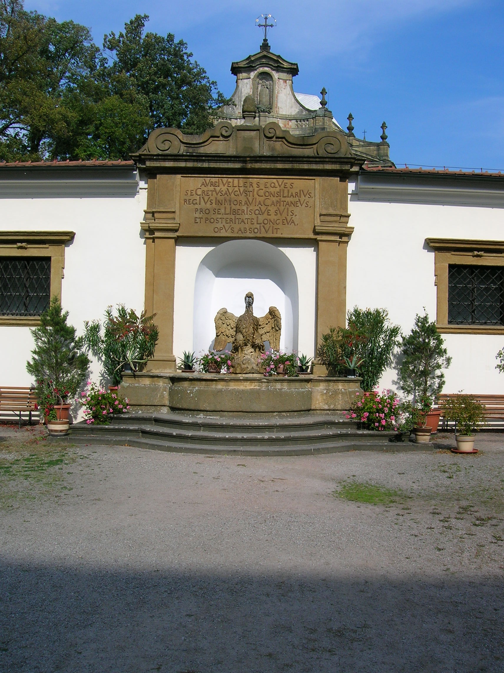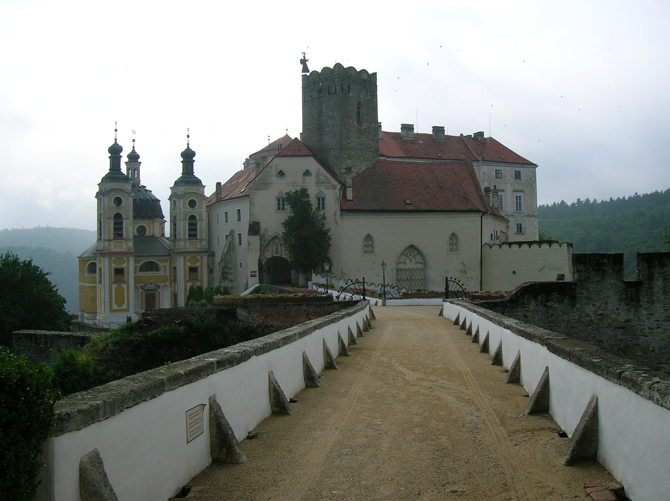It was my second visit to Vranov nad Dyjí, one of my favorite chateaus, located near Znojmo in south Moravia. Its façade was a hodgepodge of at least three architectural styles. Some medieval elements of the Baroque chateau had been preserved. The Crow’s Tower and the building in the first courtyard harkened back to the Middle Ages. The Baroque fountain was spectacular. I had to stop to admire the garden bursting with color as I walked toward the chateau. The white and yellow Baroque church with belfries was perched on a cliff to the left and below the chateau. It looked to me that it was positioned precariously, as if it would fall off the edge at any moment.
