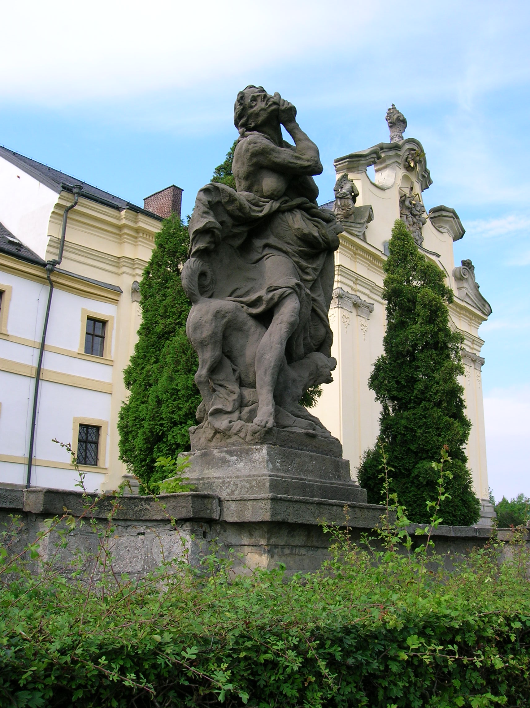 The bus to Kuks took half an hour. I only knew I was there because I saw a sign with the name of the village on a small wooden shack along the highway. I got off the bus and felt lost. I looked to my right: there was a large field, nobody in sight. To my left a building and a road. I reasoned that the village must be down the road; there must someone in the area to ask for directions. I was right: it only took only 15 minutes to come to the end of the big park in front of Kuks’ former hospital. I walked on the long path and up the stairs flanked by Matthias Bernard Braun’s 24 Late Baroque statues of Virtues and Vices.