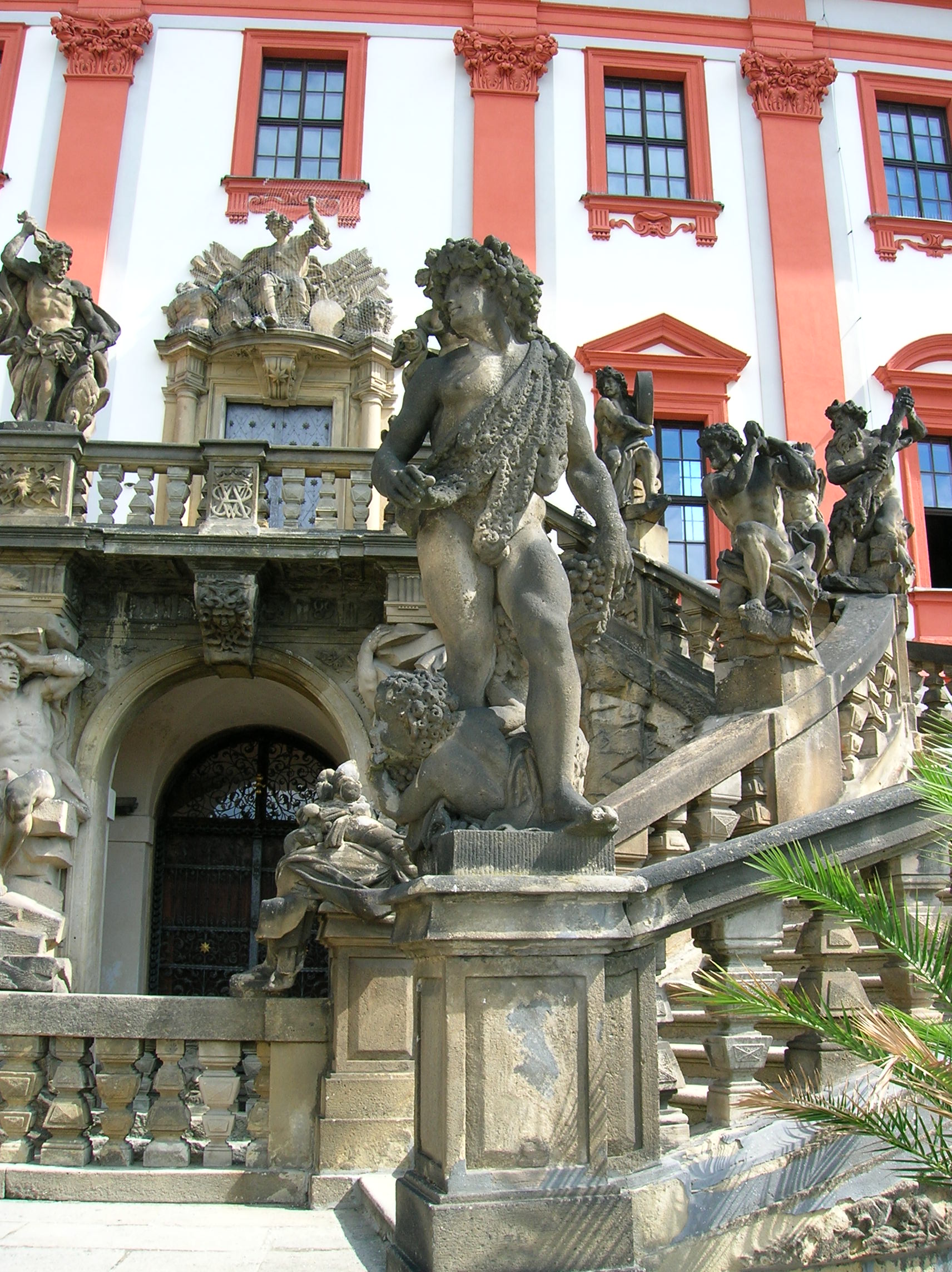 Inspired by the Roman villas he had seen during a stay in Italy, French architect Jean Baptiste Mathey designed the unconvential building with its main entrance facing the French garden. I loved the statue-flanked, two-sided staircase leading to the front doors. From the statuary created by George and Paul Heermann, I picked out the gods Hercules, Pallas Athena and Jupiter as the deities defeated the Titans. I also was enthralled with the pilasters that displayed stars symbolizing the Šternberk clan as well as the grapes and rabbit heads that decorated the ornate façade. In the garden I took note of the busts of emperors and the fountains. The large terracotta vases added an elegant touch to one of my all-time favorite gardens. I photographed the fountain depicting Neptune with a dolphin at his feet. I wished I had no pressing engagements that day and had time to sit on a bench near the chateau and read for hours.