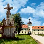 To one side of the main altar I saw the Hroznata Chapel, where the remains of Hroznata were kept in a white marble altar. A painting on the right-hand side of the chapel showed Hroznata as a knight founding two cloisters. I was especially intrigued by the altar of Saint Theodore with its finely carved wood and statue enclosed in glass. The fresco above the chapel is divided into three sections, all of which fascinated me equally: one showed Hroznata being captured by robbing knights, another showed the dead Hroznata in prison at Kinsberg Castle, and the third showed him ascending to Heaven.