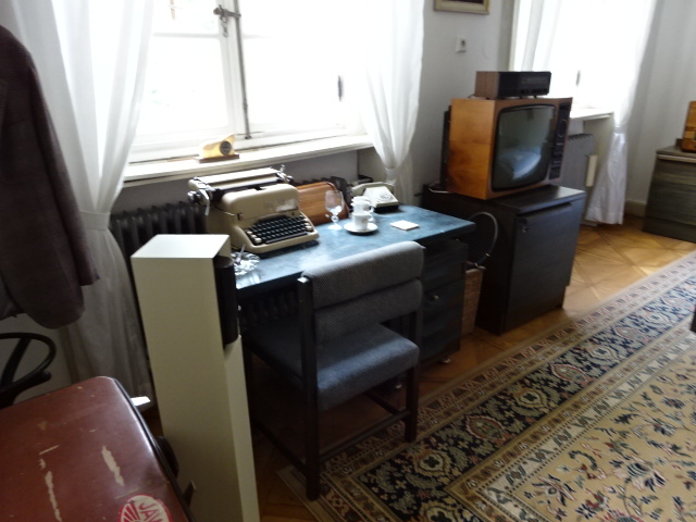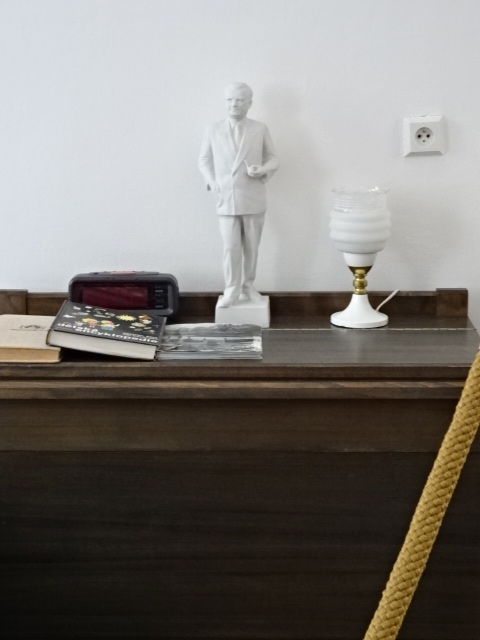 Photos from the Writers’ Room, showing portraits and statuettes of Communists and furnishings from the totalitarian era