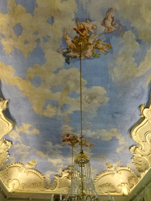 The first thing I noticed in the Ladies’ Bedroom was that the white bed with shell ornamentation looked too short, but I knew from other tours that people used to sleep sitting up or half-sitting. They were afraid they would die if they lay down, or women did not want to mess up their elaborate hairstyles. I was surprised to hear that the bed is actually two meters long. Ludwig XVI style furniture, harkening back to the 18th century, was featured in this opulent décor. A copy of Raphael’s Madonna hung in the room. The guide told me a legend about the Venetian mirror: People who look into it will have their wishes fulfilled as long as they do not gaze into another mirror for a year.