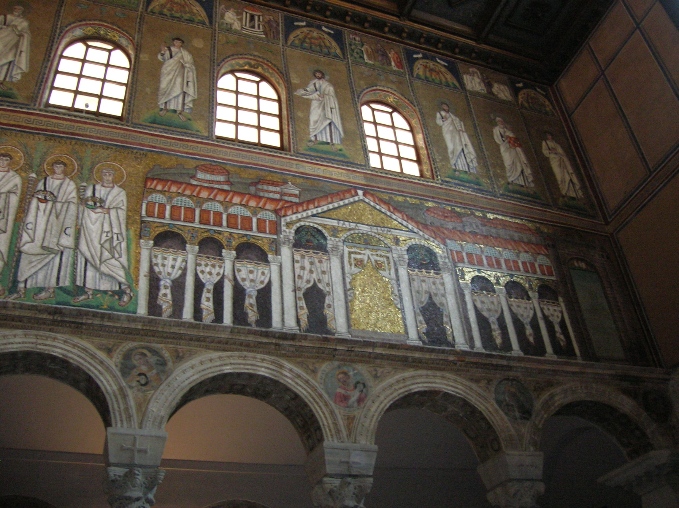 I concentrated first on the mosaic of Theodoric’s lavish palace with loggias, arcades and a peristyle. I felt as if I could walk into the palace, even though the rendition had some unrealistic spatial characteristics. Still, the palace looked so real to me. I could almost see Theodoric the Great strolling through the loggias.