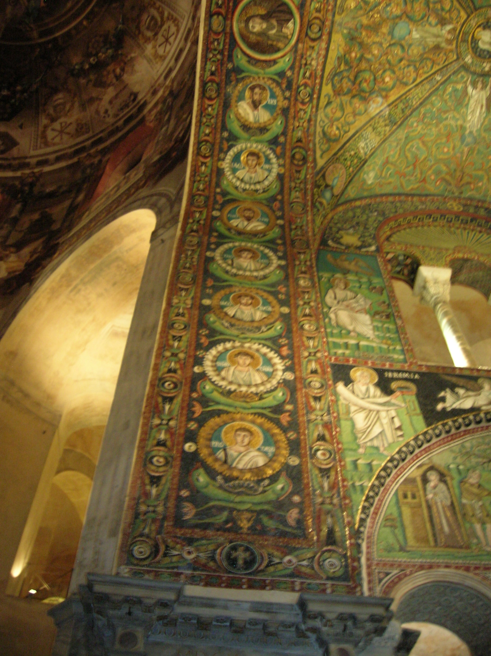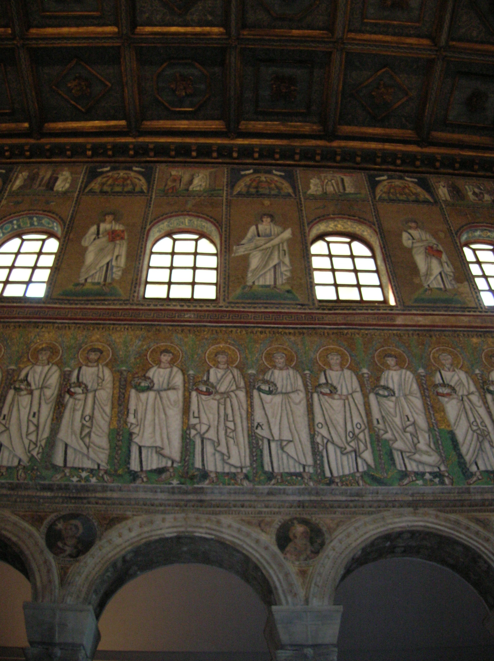 The portrayals of the processions caught my undivided attention. On one side there was a procession of 22 virgins and on the other a procession of 26 martyrs. Because some sections were added much later, it was possible to see Roman characteristics as well as the stylized Byzantine features.
