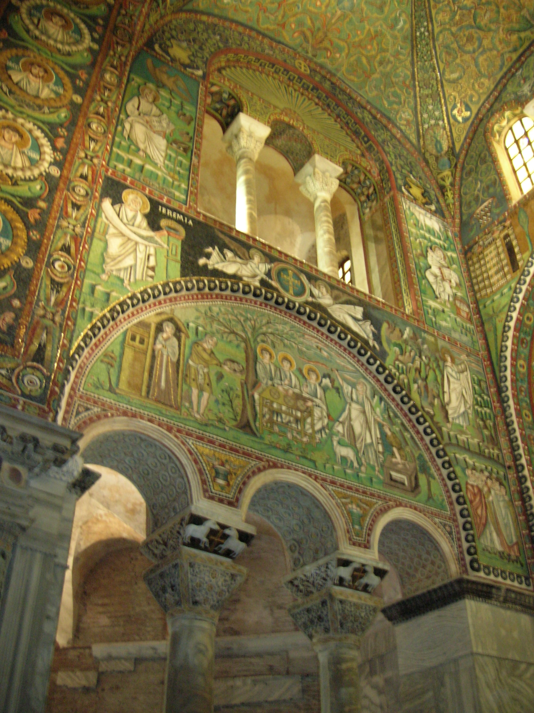 Back to the Basilica of Sant’ Apollinare Nuovo. The exterior was simple in design. I noticed the marble portico, and the cylindrical bell-tower from the 9th or 10th century immediately caught my attention. Inside, the décor was not simple at all. The three-nave structure showed off 24 columns with Corinthian capitals but mostly boasted of the mosaics from Theodoric the Great’s reign. Originally this place had been intended as an Arian place of worship.