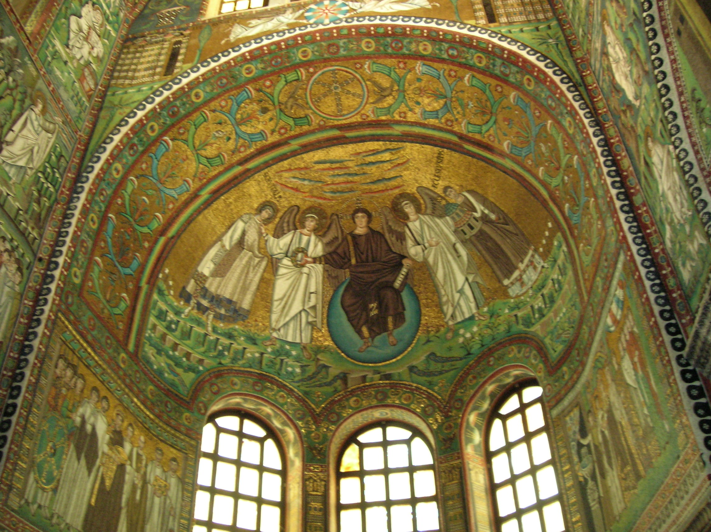 There was much more to see. The octagonal-shaped Arian Baptistery had four apses. Even though only the dome’s mosaics have survived the centuries, it was rich in artistic treasures. In the center Christ stands in hip-high water as John the Baptist baptizes Him. Above Christ’s head is a dove. The outer circle is filled with crown-carrying Apostles separated from each other by palm trees. I liked the detail of the blue precious stones decorating the crowns.