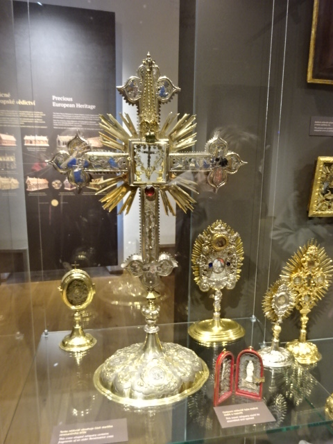 In the fourth room I looked at the original oak box that had been found inside the chest. The restorers had to create a new wooden core for the object. The display cases along the walls showed various reliquaries. In one case I saw two gem-studded rings. I also gazed at a number of golden Baroque monstrances, so elaborate that they almost made me dizzy.