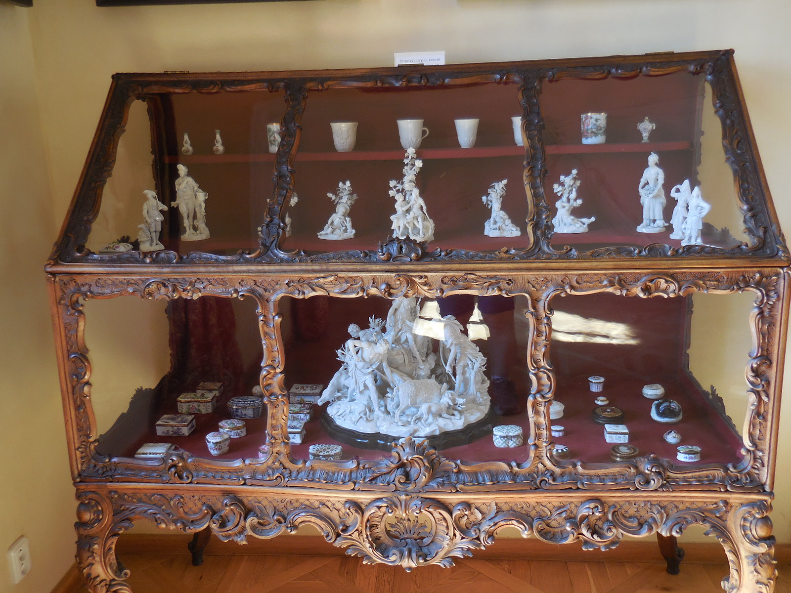 Next came the Rococo Room, where two Rococo display cabinets displayed various objects, such as snuff boxes, exquisite fans and Meissen porcelain. I admired the rich carving of the woodwork on the cabinets. Seeing the Meissen porcelain reminded me of the Museum of Porcelain in Dresden, where there was so much Meissen to behold that it had been overwhelming for me. The superb display cases dated from the 18th century.
