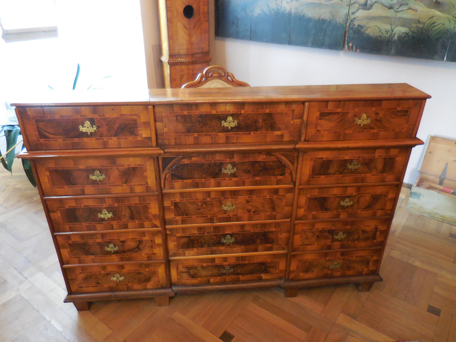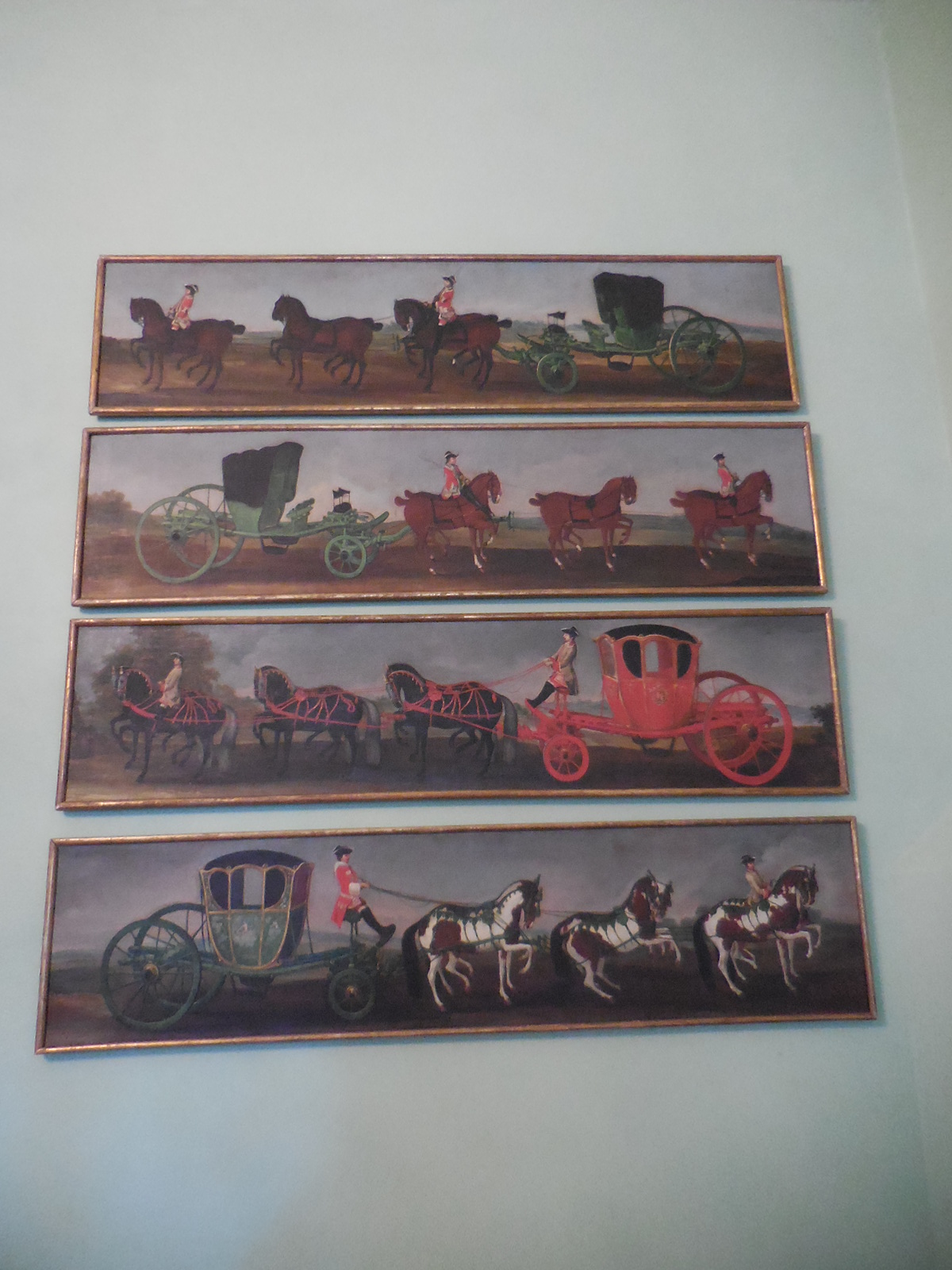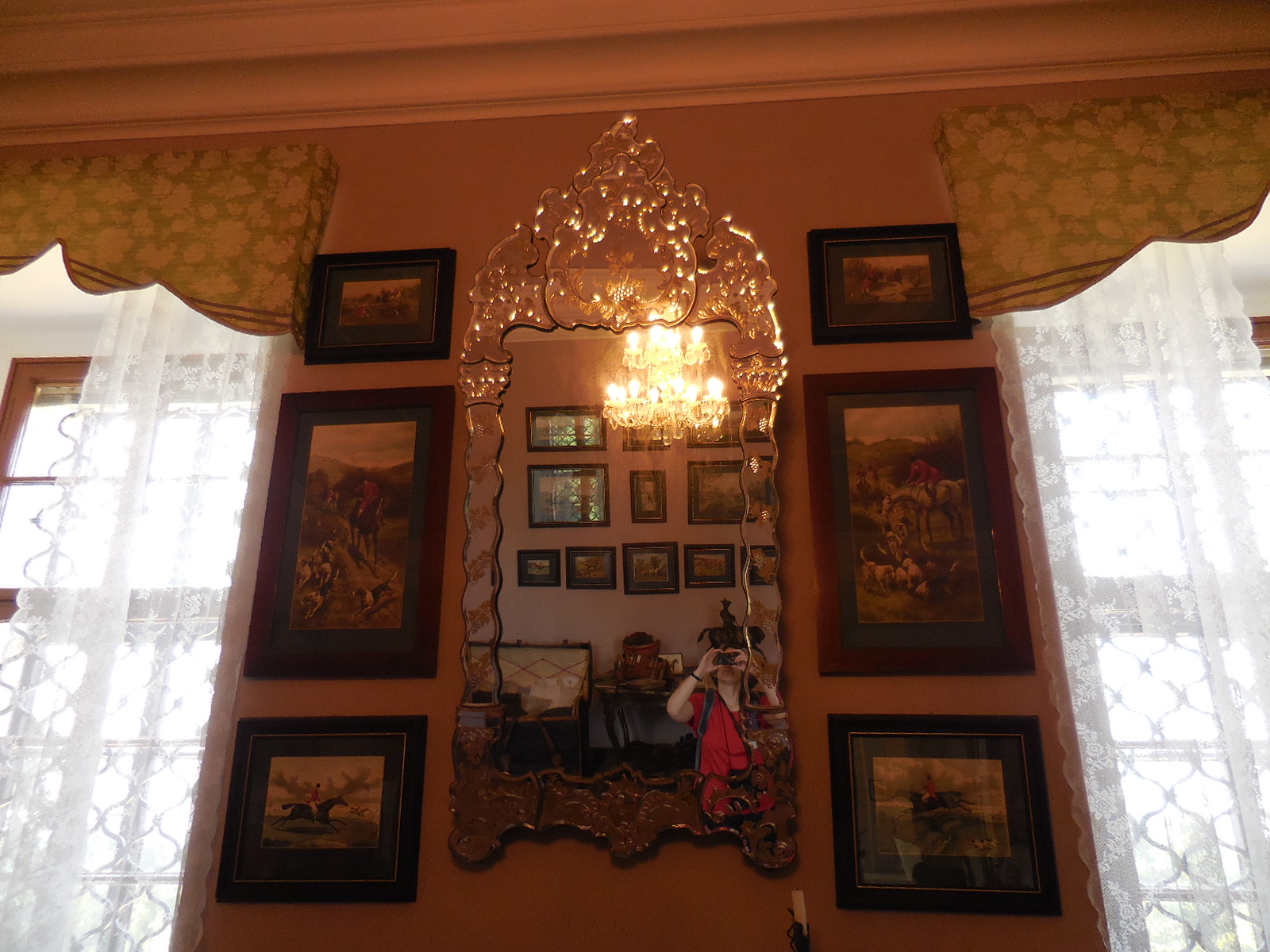 In the next room I saw Oktavián Kinský on the clan’s best horse, and other works featured representations of the isabela or Kinský beige horse. Another space featured paintings of hunts. The guide told us about the two types of hunting in which nobles had participated here – the French “par force” style during which the animal was killed and the English style during which the animal was returned to the forest. In paintings I saw the hunters sporting red jackets, black hats and white riding breeches. There was more than art featuring horses here, though. I marveled at a desk made with intarsia, hailing from the 18th or 19th century. A Venetian mirror also caught my eye.
