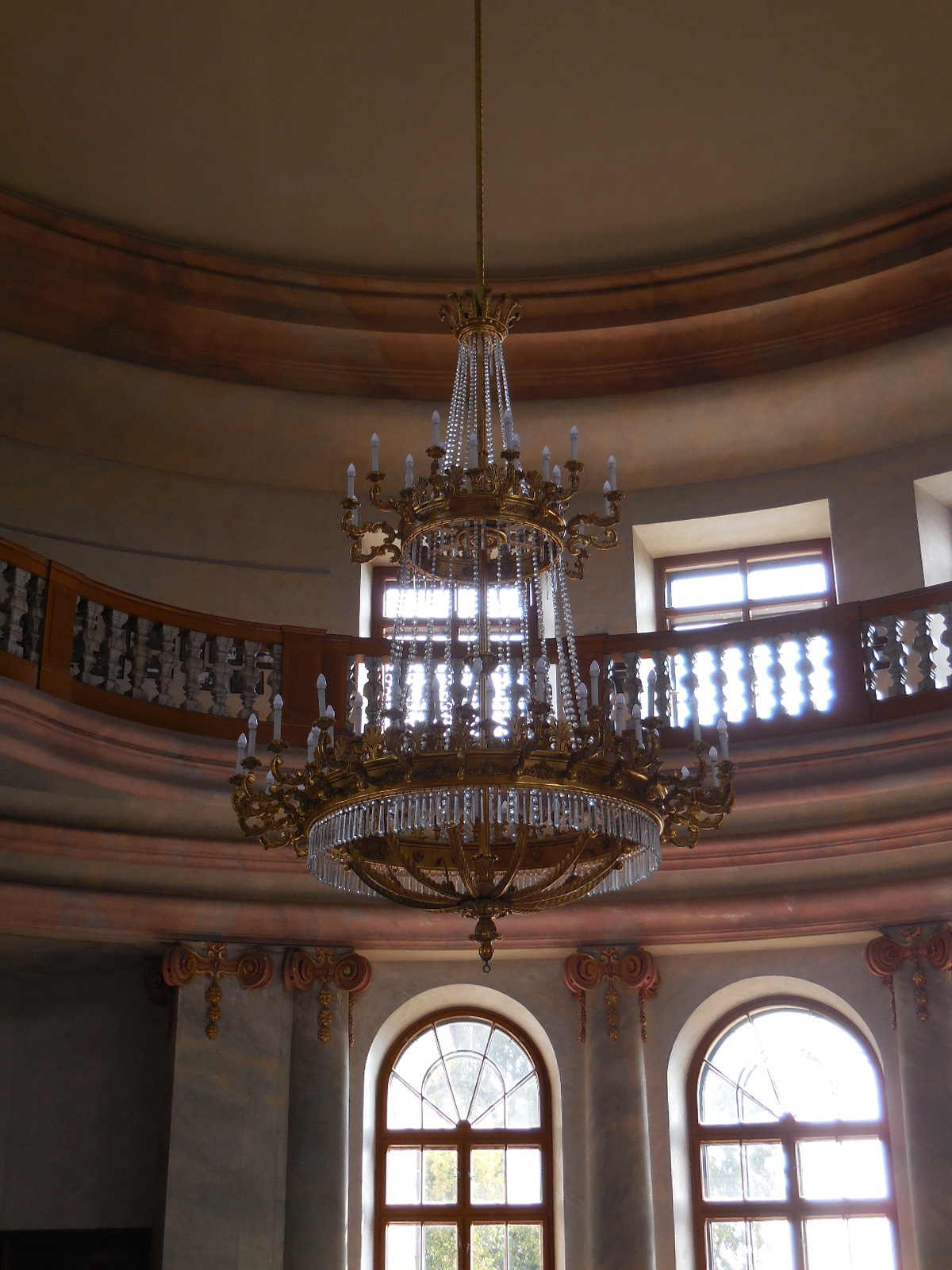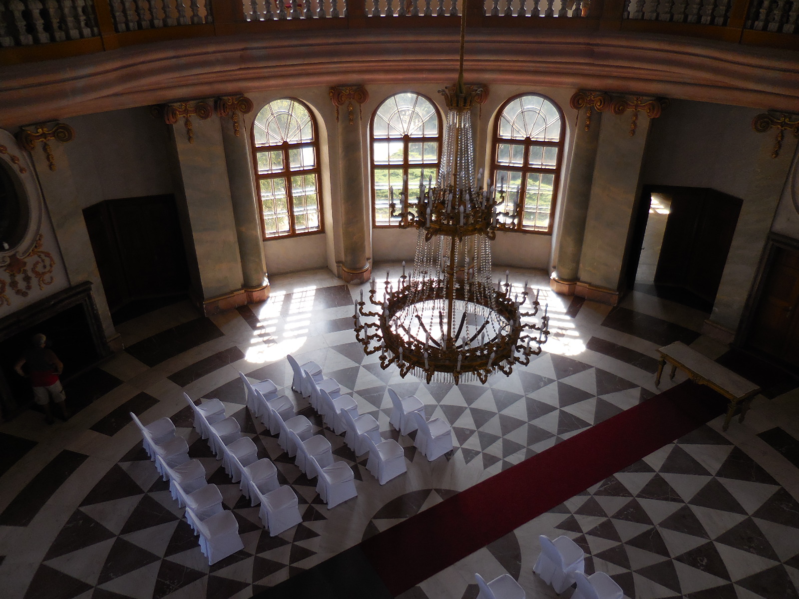 After touring the three wings, we went upstairs to the Marble Hall. It was so elegant that I was speechless. The two lavish fireplaces were made of real marble, while most of the other marble in the large space was imitation. An exquisite chandelier was 2.2 meters high. The floor was decorated with geometric shapes, and I was reminded of Santini’s fondness for mathematical symbolism.