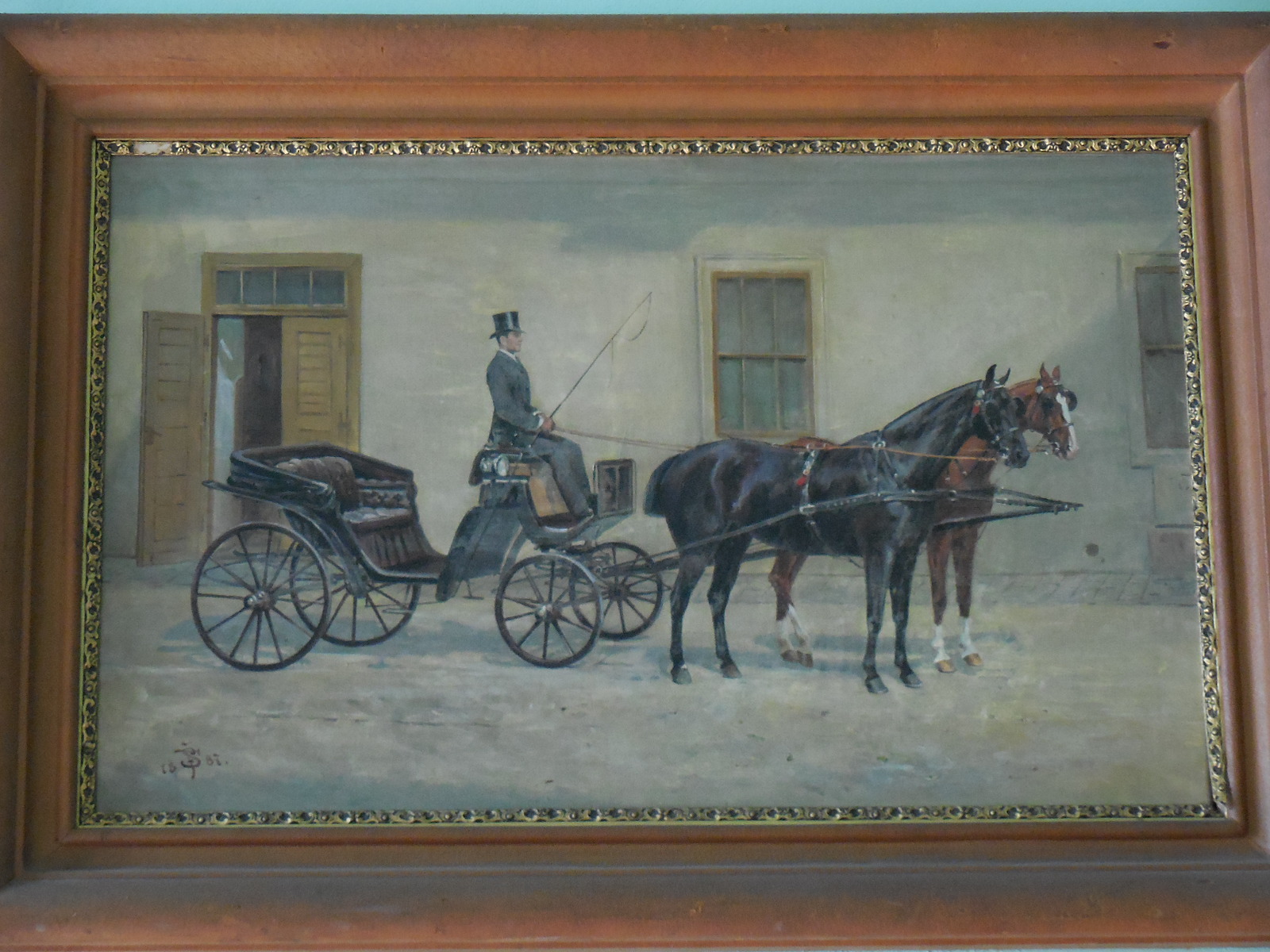 The next section was devoted to the Kinskýs’ love of horses as numerous pictures of horses adorned the walls. I saw dun horses bred at the Kinský’s studfarm and English horses. Other renditions showed horses from the Spanish Riding School. Paintings of horses jumping over barriers in steeplechase races also decorated the walls, and the guide proudly told us that the Pardubice steeplechase originated here. Other paintings showed horses and dogs going on hunts. A saddle hailed from World War I. I would never ride a horse because I would be too scared that the animal would bolt. Also, large animals frightened me, even big dogs. I knew many people who loved riding, but my fear did not allow me to share their excitement. I had not been very interested in horseracing or horsebreeding until I came here and learned about the Kinskýs’ passion for horses. They had certainly played a major role in horsebreeding.