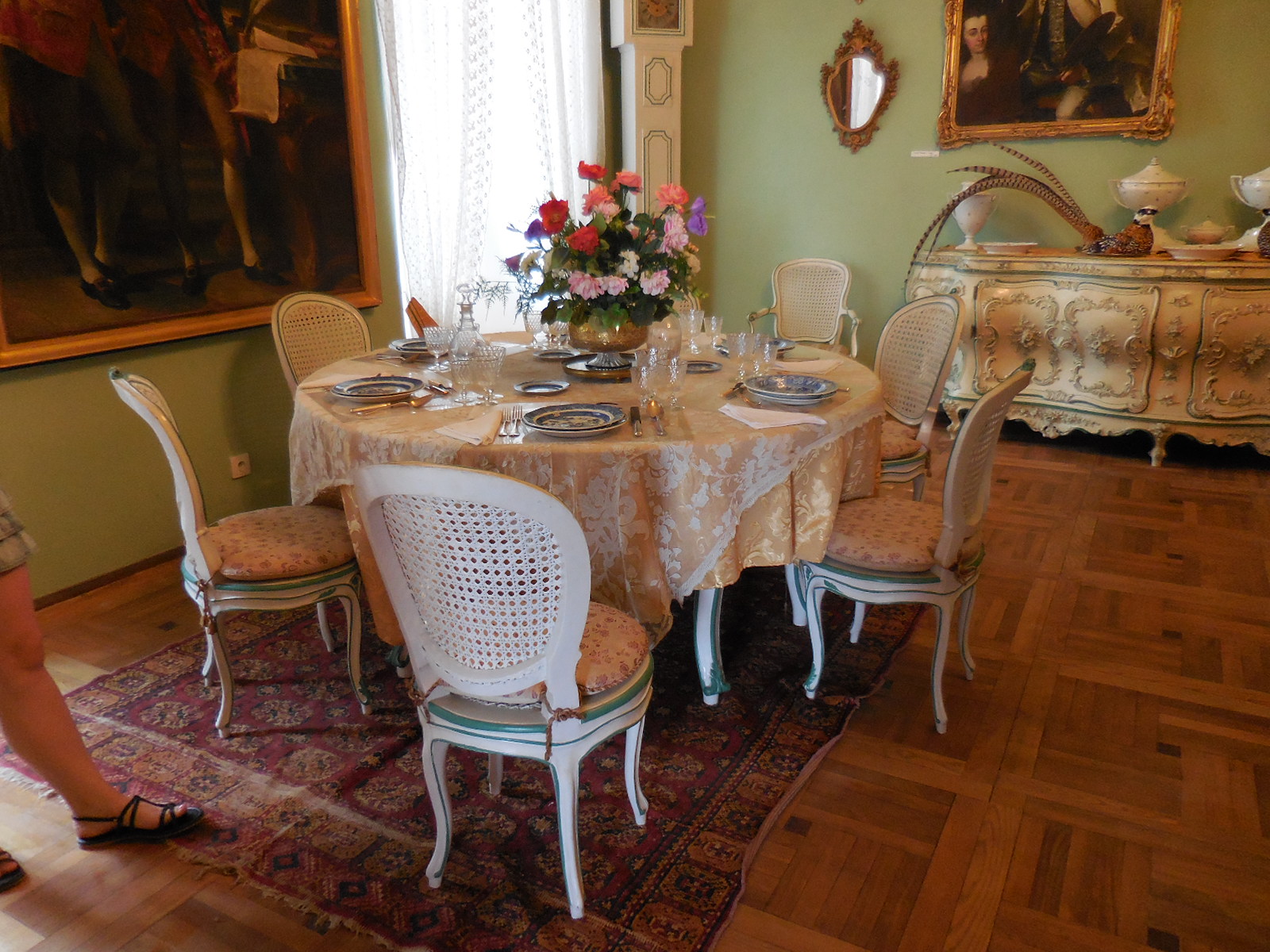 The Dining Room showed off distinguished portraits of the Kinský family as well as portraits of Emperor Joseph II and Emperor Leopold II. Another space boasted elegant Viennese porcelain. I loved the exquisite chairs, some of which were decorated with green roses on the tops of the backs. Those sporting the roses were designated for women while the ones without floral adornment were meant for men.