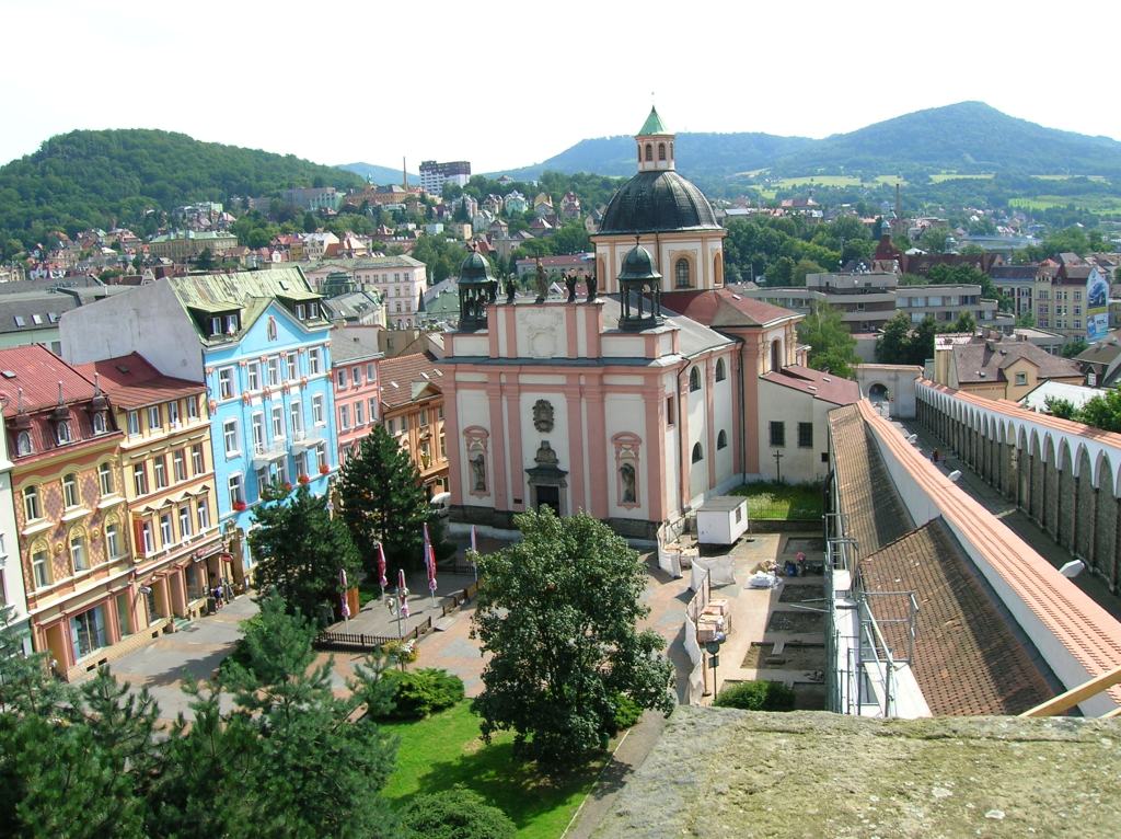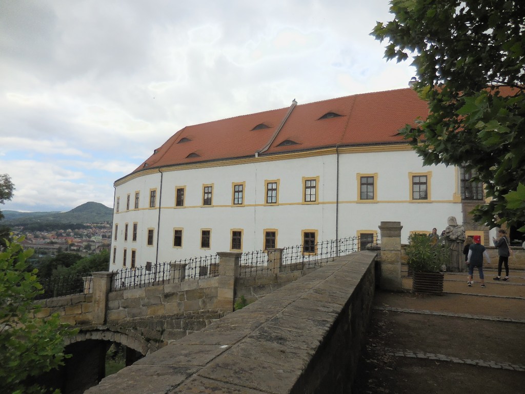 Paintings punctuated the chateau’s décor. One disturbing work showed the building with boars killing dogs in the foreground. At weddings in past centuries, guests had entertained themselves by watching such gruesome events. I noticed the paintings of the town by Karel Graff, whose 26 renditions of Děčín were exquisite. I especially liked a painting of an Italian market by Francesco Bassano. It triggered memories of my many trips to Italy, a place I longed to visit again. I was hesitant to travel there during the pandemic. Another unique and dramatic painting called “Cross in the Mountains” depicted Christ on the Cross with a background of cliffs dotted by evergreens adding vibrancy to the work. I saw other black-and-white paintings of scenes from the Battle of Waterloo. The last room we visited was the elegant Baroque Chapel of Saint George with a main altar featuring a painting of this saint. Exquisite tiled stoves dotted the numerous rooms.