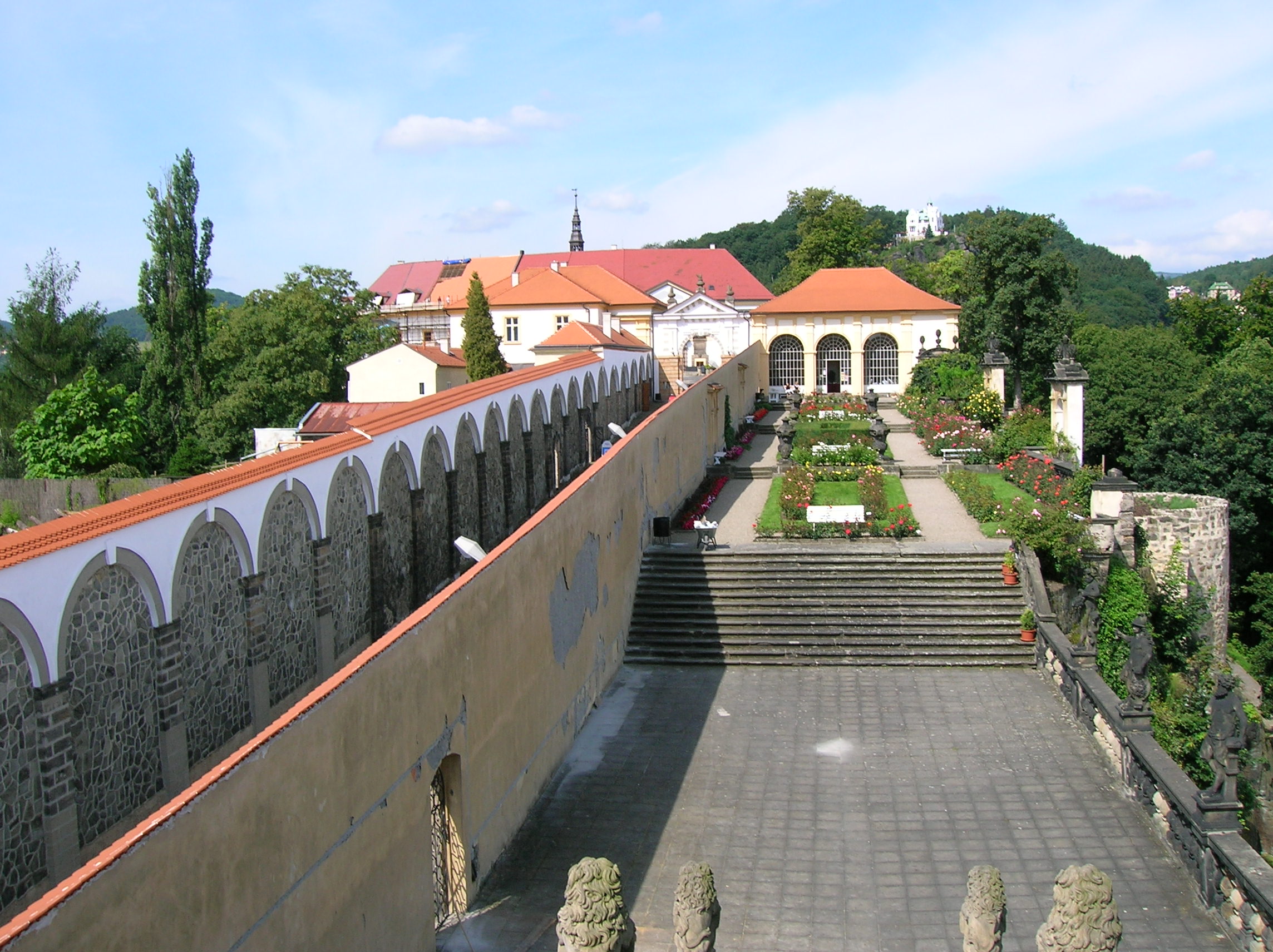 He also had the Long Drive built. This was a steep, Baroque driveway that measured 270 meters long and 9 meters wide. The walls surrounding it were seven meters high. Blind arcades with 64 columns added to the elegance of the approach to the chateau. On one side there was the rose garden with a gloriette and statues of mythological gods as well as a sala terrena. The last major renovation took place from 1783 to 1803 in Baroque-Classicist style, which gave the chateau its current appearance.