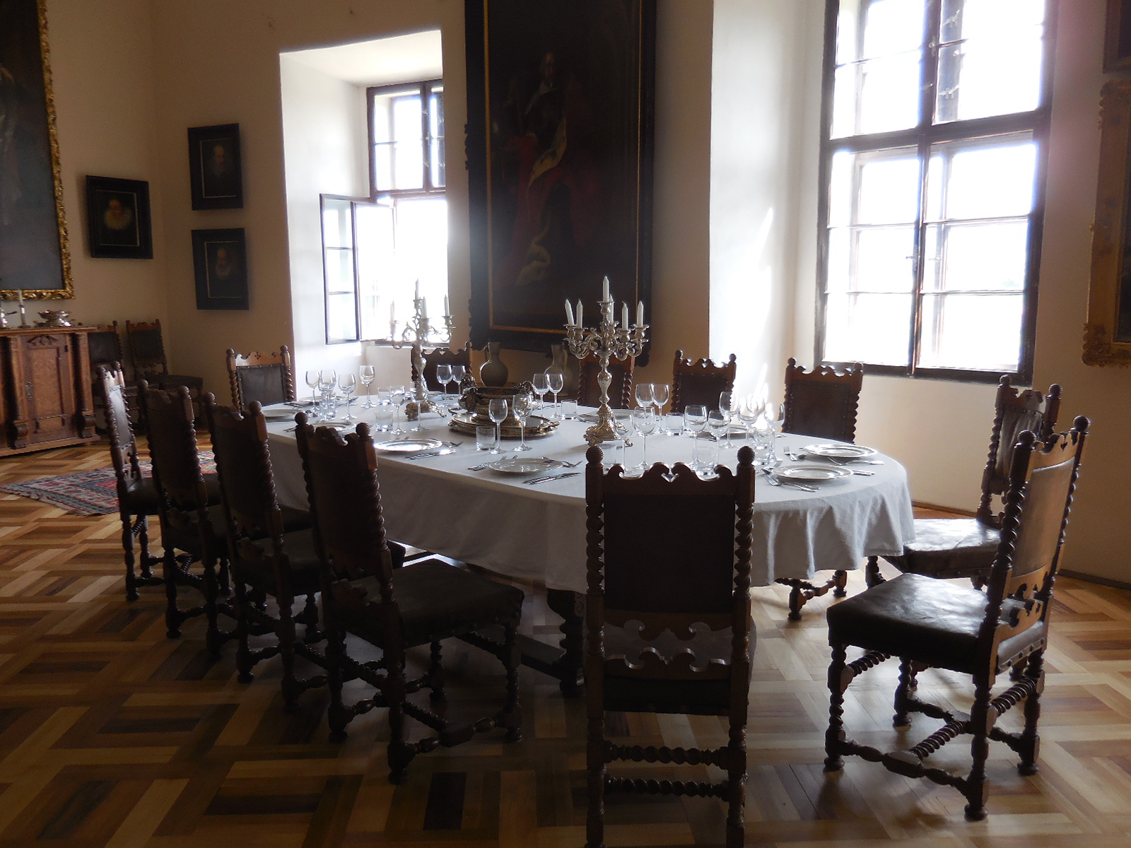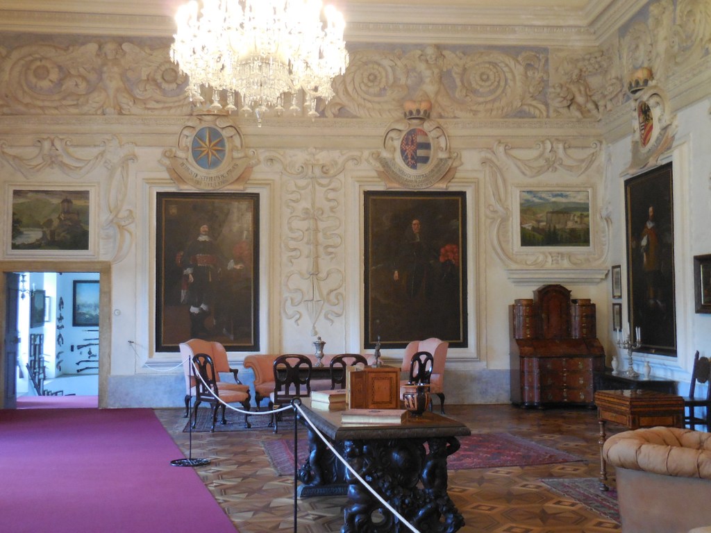 The first room, the Knights’ Hall, has always been my favorite. Every time I stepped inside, I felt overwhelmed by the beauty of the large space with 17th century stucco decoration and two Czech crystal chandeliers weighing 250 kilograms each. An eight-pointed Sternberg star decorated the floor. On the walls portraits of generals from the Thirty Years’ War stared at me. George of Poděbrady’s painting also made an appearance. A variety of chairs were situated in this space. Some cozy-looking seating dated from the early 20th century while others hailed from the Gothic and Renaissance periods. I especially was drawn to the 17th century Florentine cabinet. The semi-precious stones and pieces of marble decorating it were sublime.