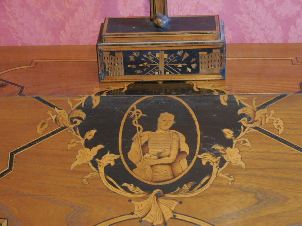 I loved the wall painting of idyllic landscapes in the Yellow Salon. I also was captivated by yellow because it had been the color of my mom’s kitchen, where I grew up. The color symbolized for me my mother’s optimism and calming voice telling me my problems would soon be solved, the sun would soon be out. The ceiling was captivating, too. The 18th century stucco ornamentation was amazing. In the Ladies’ Lounge, the ceiling was no less spellbinding. I was enamored by the Baroque frescoes above me. It intrigued me that the 18th century Rococo chairs lacked armrests. Ladies had donned such wide and huge dresses that the armrests were not needed. I would have loved to have been seated at the writing desk hailing from the second Rococo period. What kind of letters would I have written at that desk decorated with carved ivory? Perhaps letters to my parents and friends in the USA.