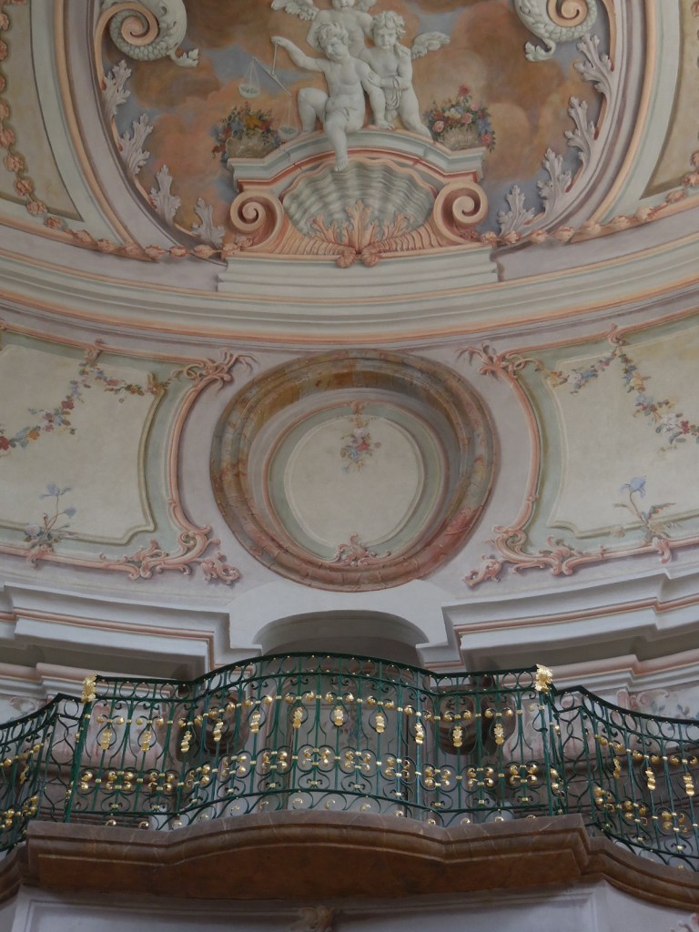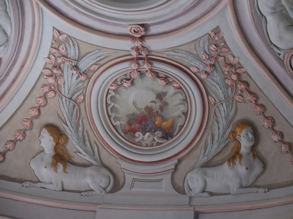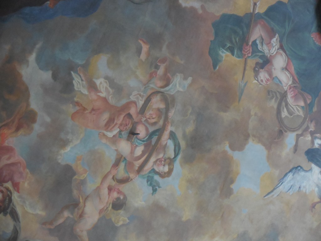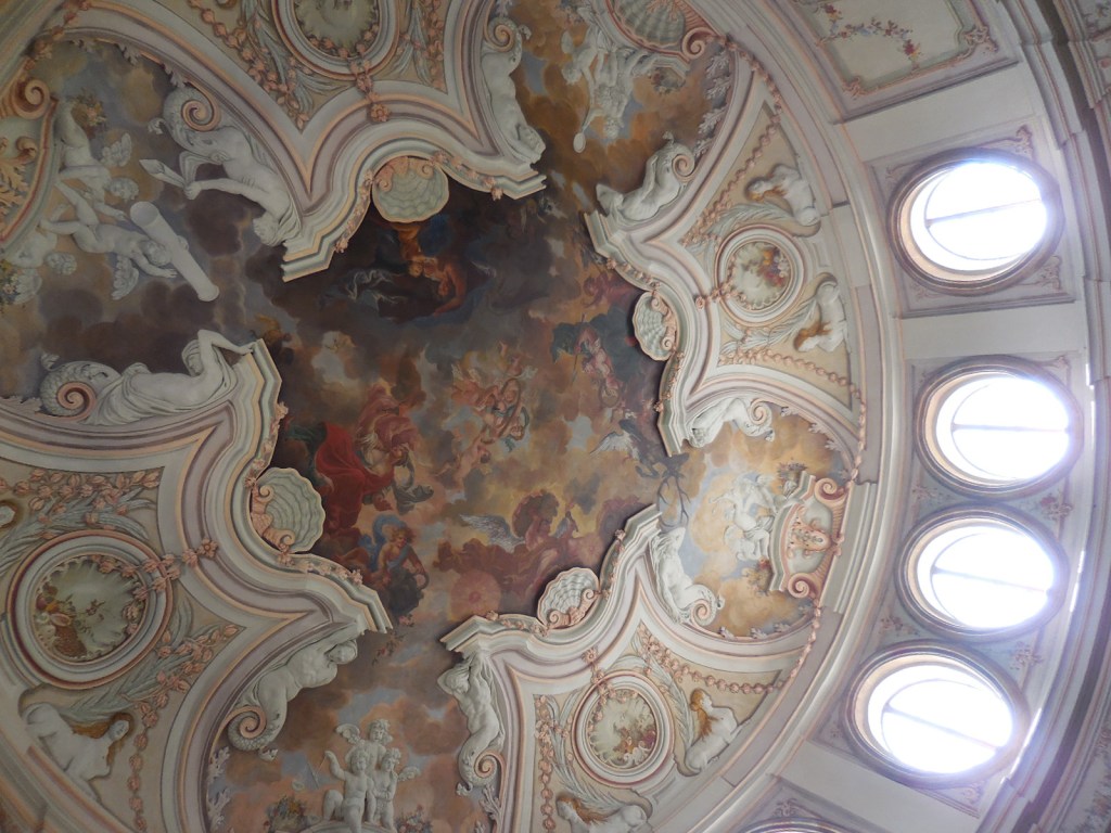 The interior did not disappoint. Both tours started off in the grotto with its exquisite painting of people and animals. Then we proceeded to the main hall with its stunning ceiling fresco and large portraits. One of the two monumental fireplaces in the room was artificial. One of the two elegant balustrades was also fake, though it was difficult to tell.