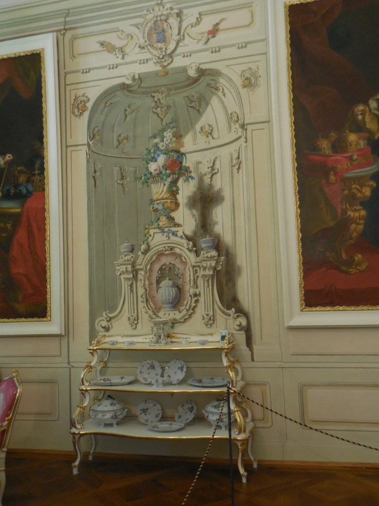The first tour displayed mostly Baroque and Rococo styles. The tiled stoves were beautiful, especially one decorated with the body of a white serpent. What I liked best was the Chinese wallpaper that adorned a room. I also was impressed with other wallpaper that displayed red, blue and yellow designs as well as green foliage on a white background.