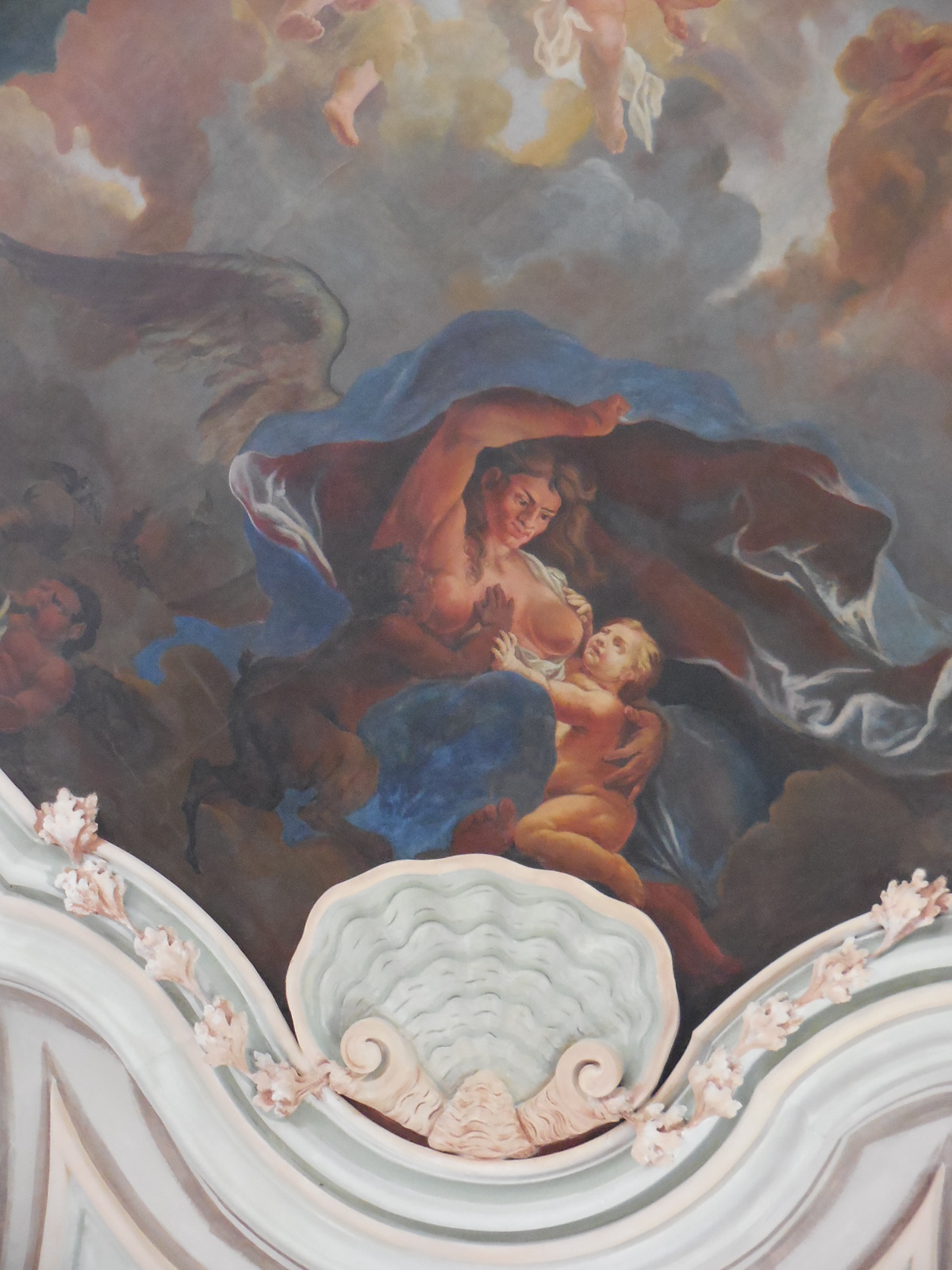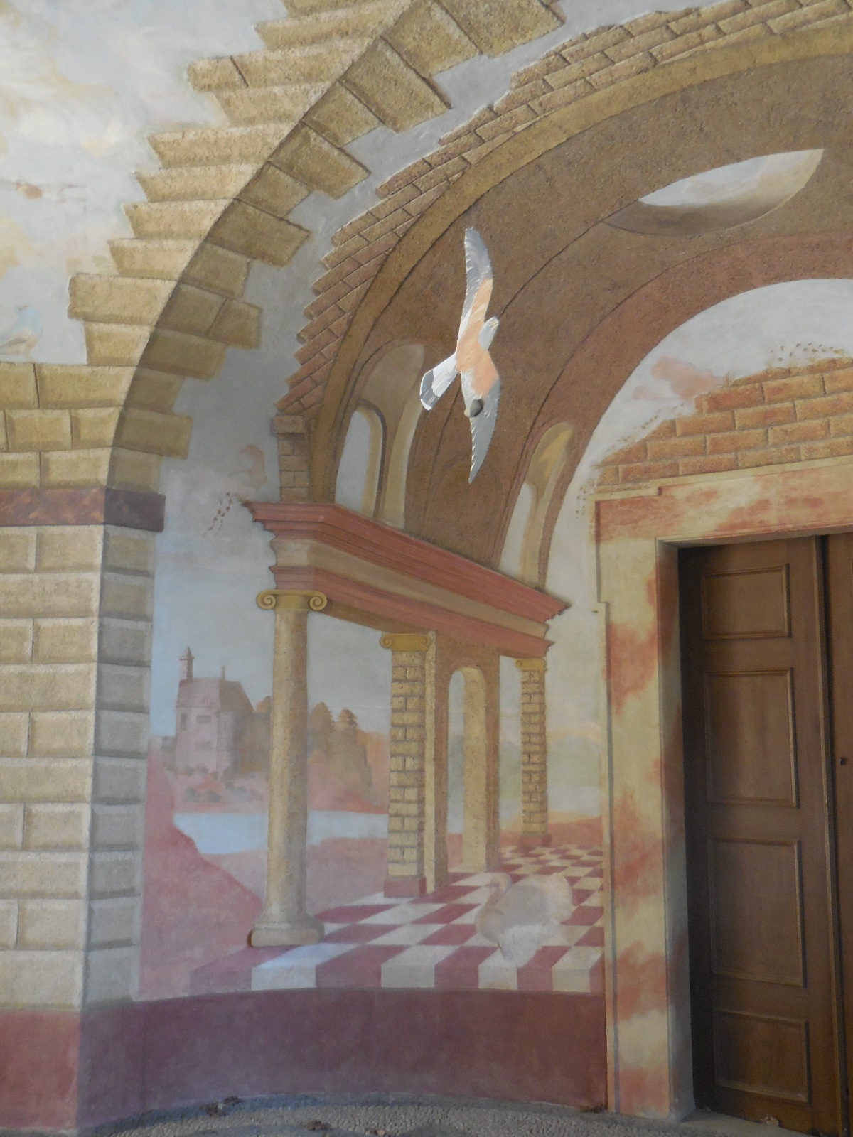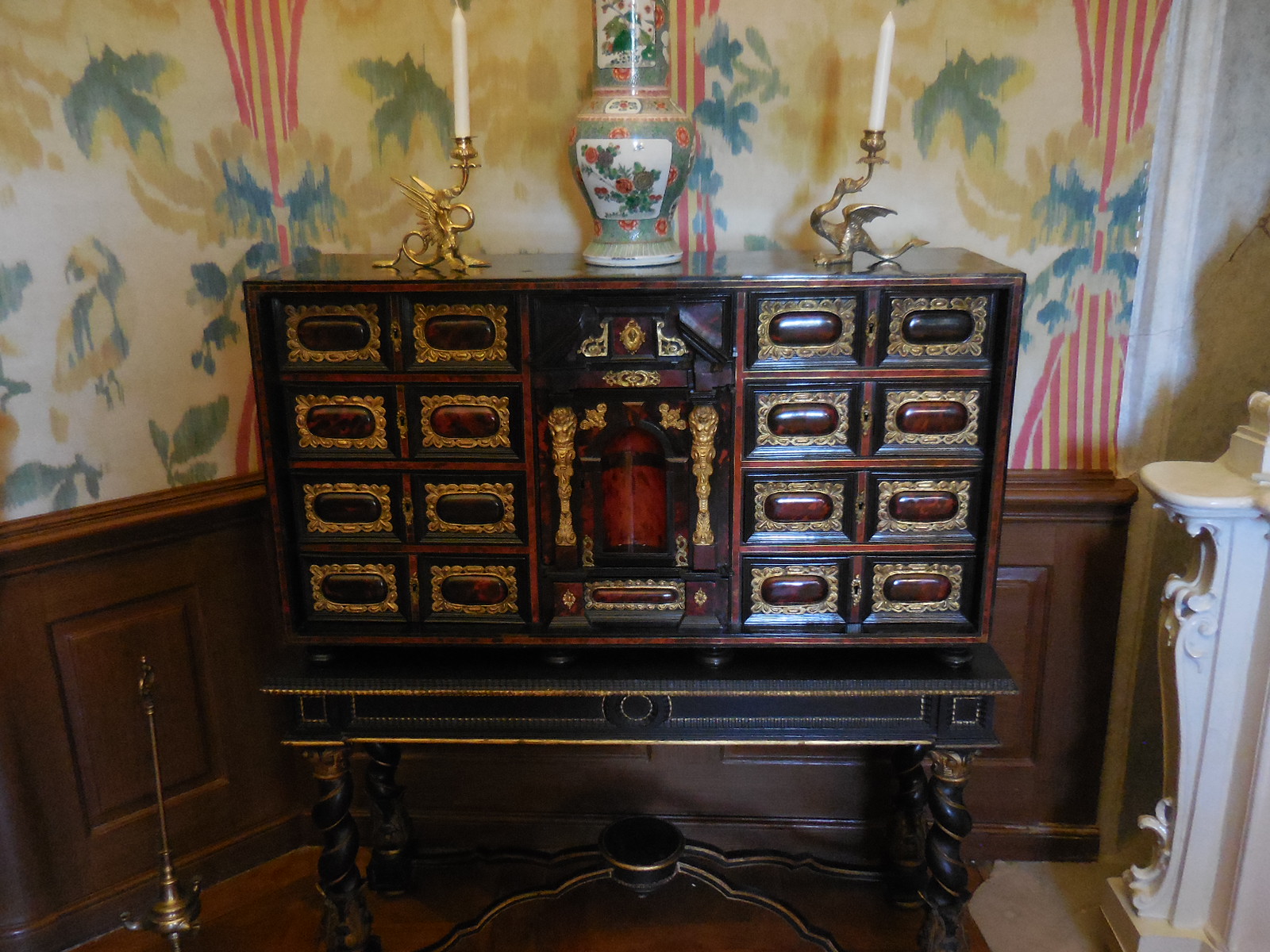 The interior did not disappoint. Both tours started off in the grotto with its exquisite painting of people and animals. Then we proceeded to the main hall with its stunning ceiling fresco and large portraits. One of the two monumental fireplaces in the room was artificial. One of the two elegant balustrades was also fake, though it was difficult to tell.