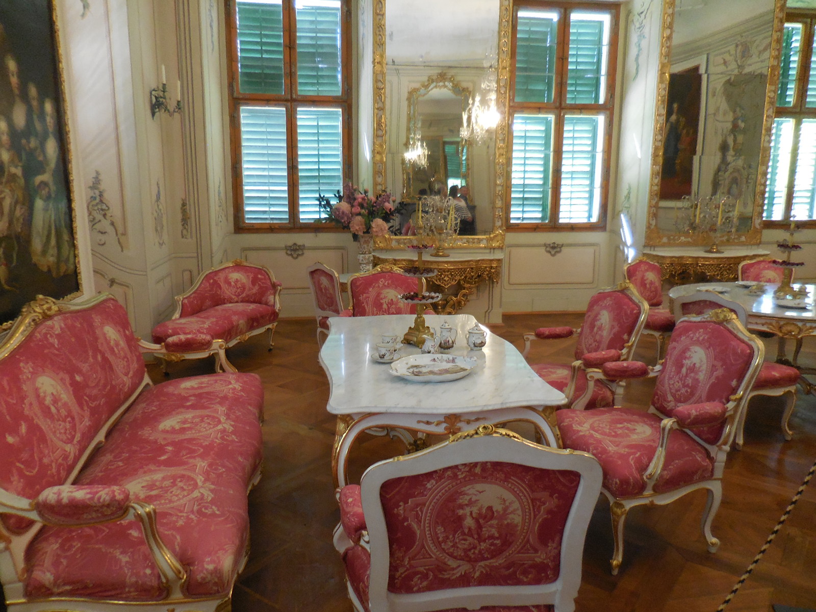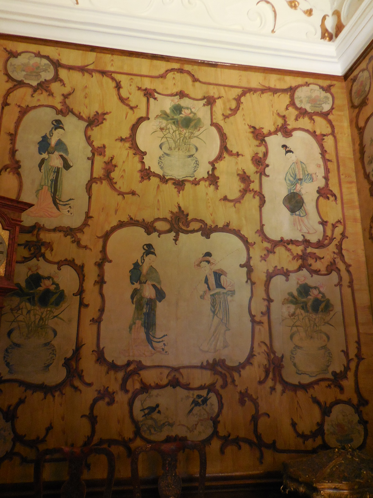 The first tour displayed mostly Baroque and Rococo styles. The tiled stoves were beautiful, especially one decorated with the body of a white serpent. What I liked best was the Chinese wallpaper that adorned a room. I also was impressed with other wallpaper that displayed red, blue and yellow designs as well as green foliage on a white background.