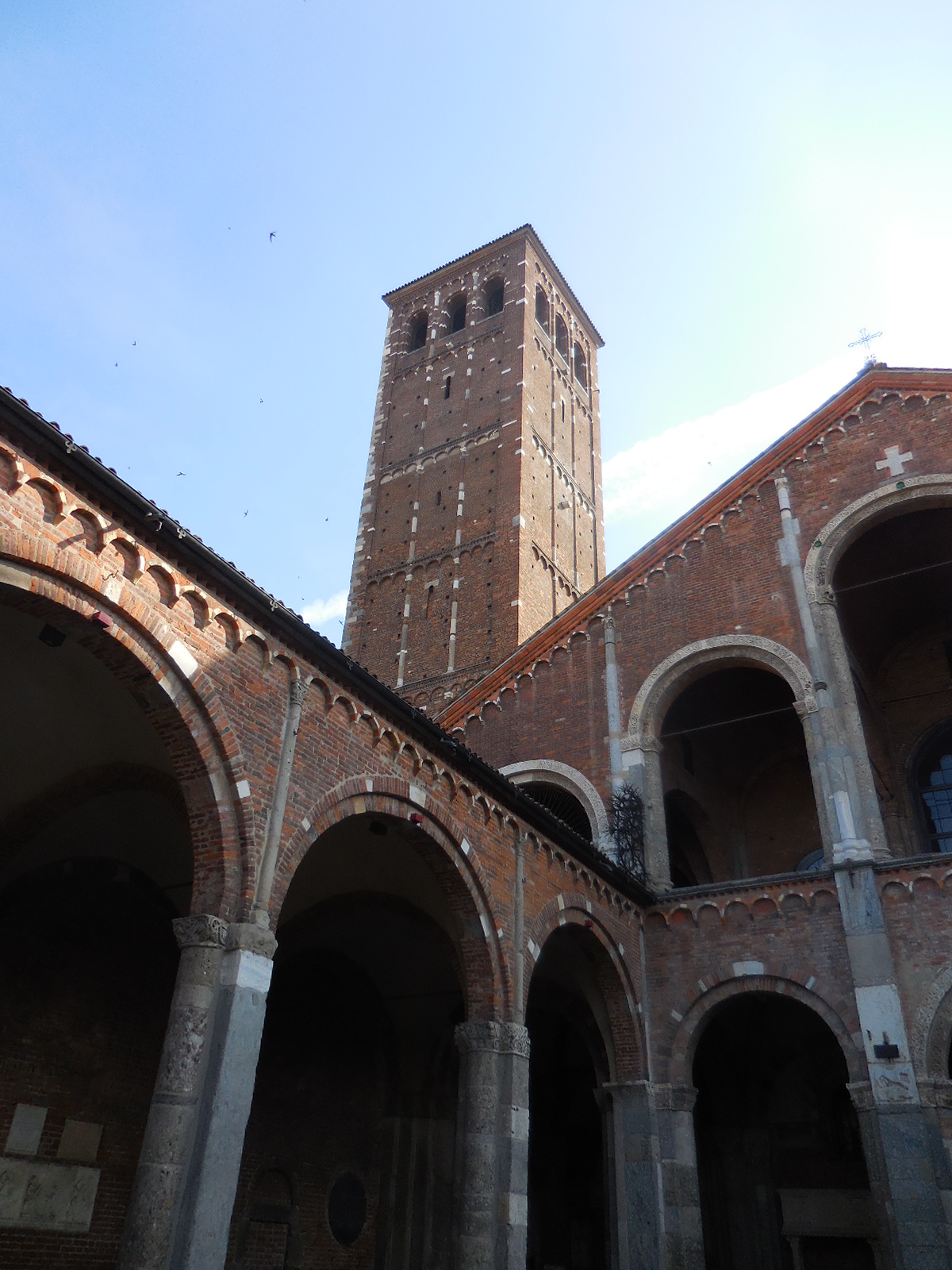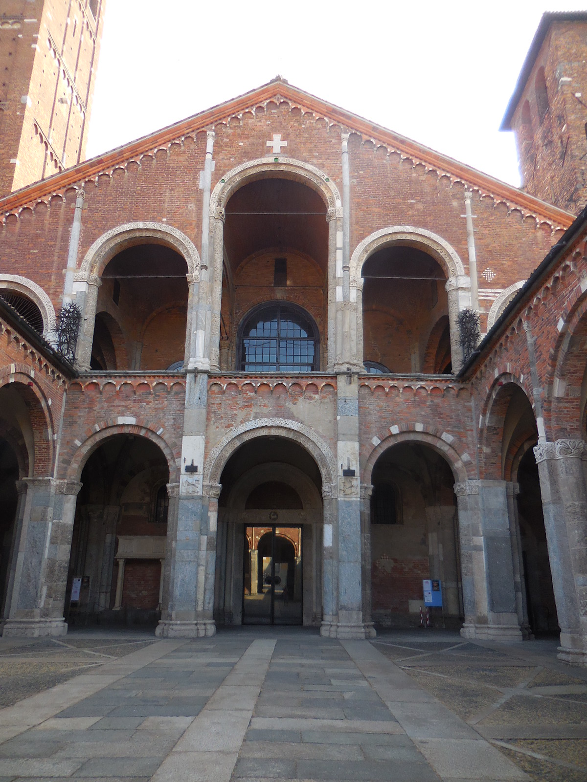 When I entered the large courtyard of the basilica in Milan, I thought that this must be one of the most beautiful Romanesque buildings I had ever seen. I reminded myself that I was looking at one of the oldest churches in Milan, built by Saint Ambrose in the fourth century over a cemetery for martyrs. Saint Ambrose had built four churches, then situated outside the walls of the city. A monastery was located there from 789, housing two different monastic communities who had each built a bell tower.