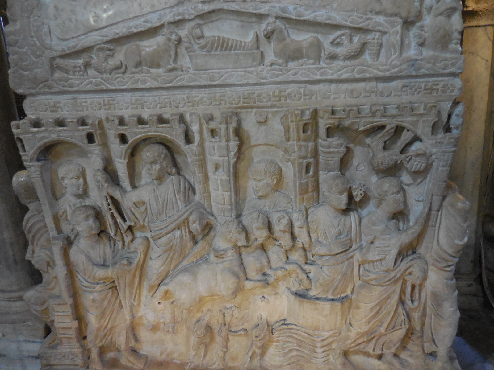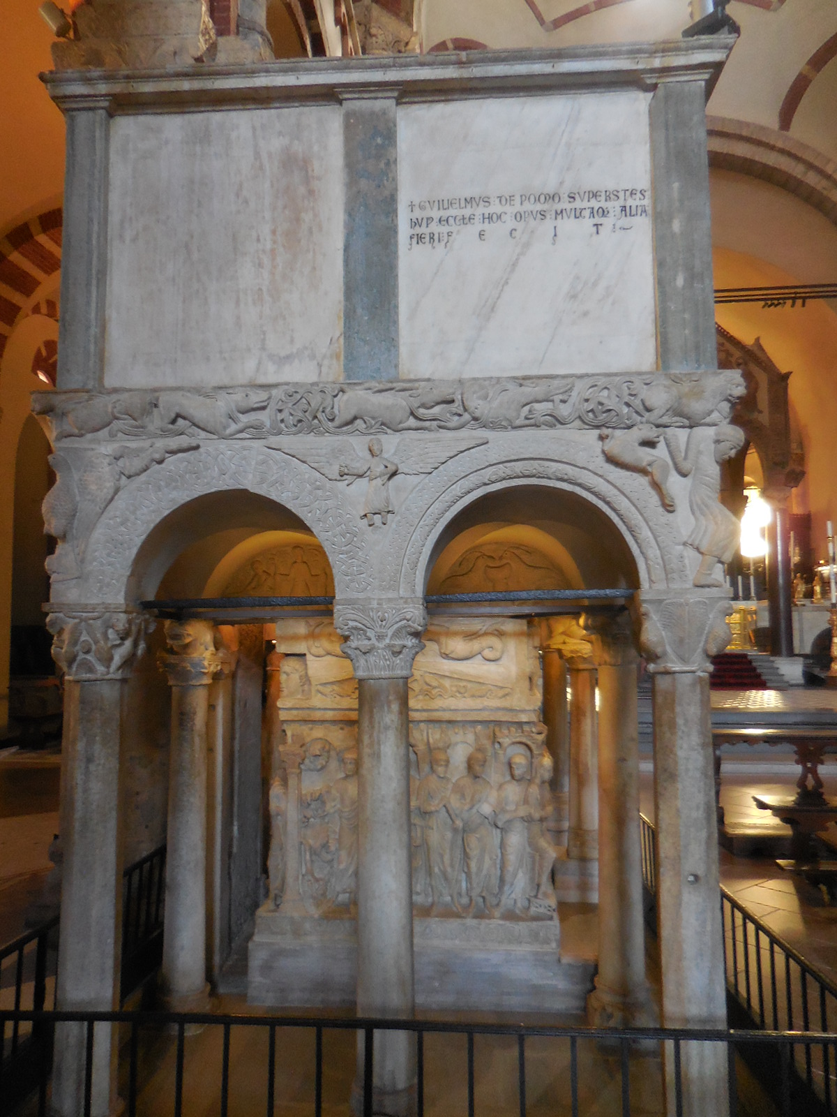 The pulpit was for me perhaps the most intriguing part of the church. It hailed from the 12th century and boasted two gilt copper reliefs showing an eagle and seated man, symbolizing apostles John and Matthew. The base of the pulpit was the fourth century sarcophagus of Stilicho with amazing reliefs from the Old Testament. I also noticed Apollo riding a chariot.