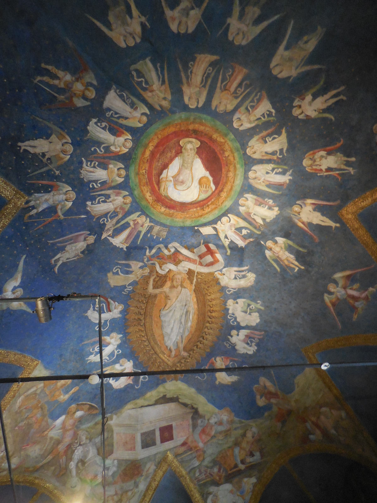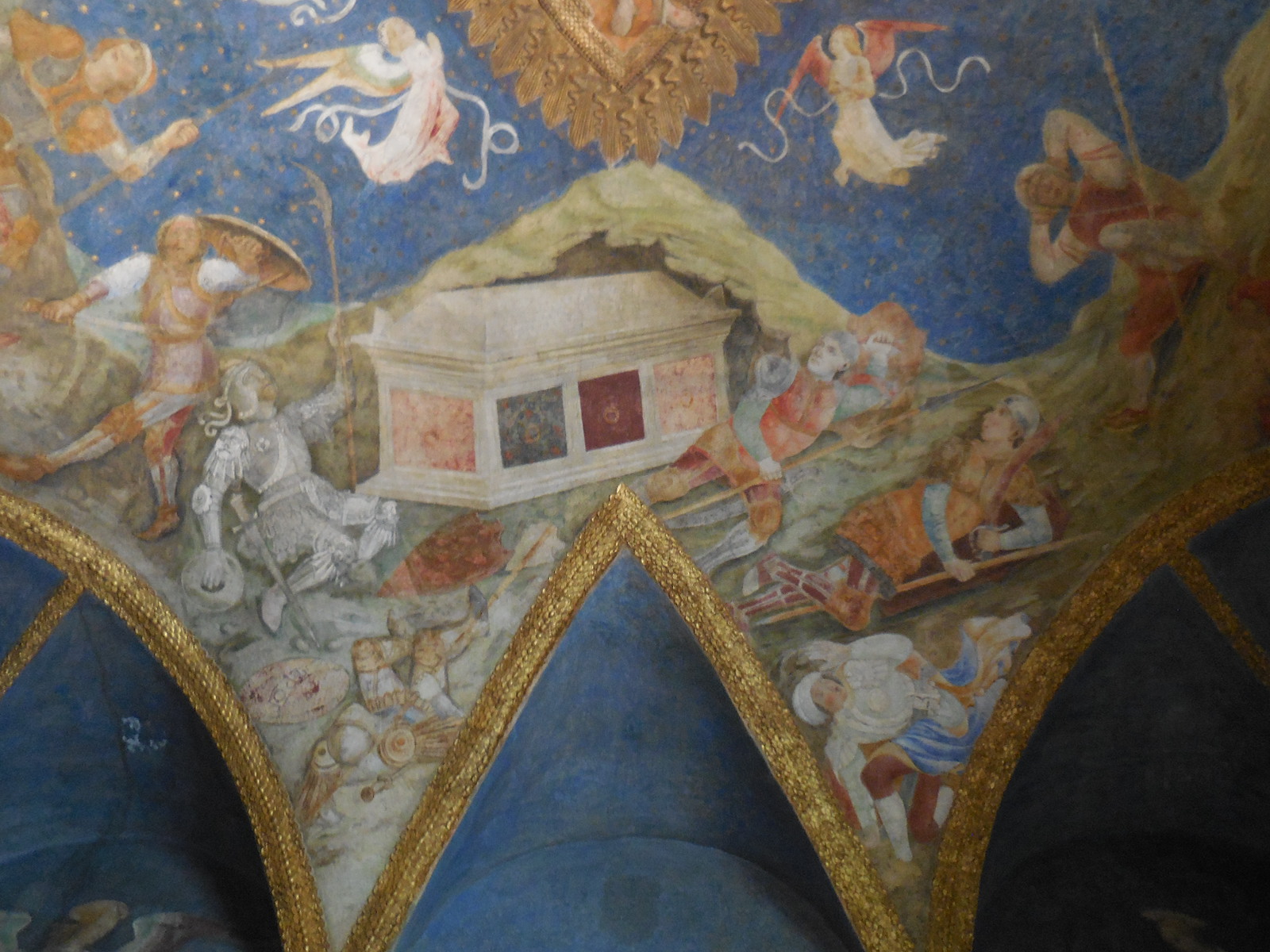 Visitors walk through the ducal apartments decorated by Galeazzo Maria Sforza. I was especially impressed with the ducal chapel. Leonardo da Vinci designed and frescoed the Sala delle Asse (Room of Wooden Boards), which was being restored when I was there. I read that the walls and vaulted ceiling of this room are painted with trompe l‘oeil. The vault shows off branches leaves and berries that give the illusion that the space is outside instead of in a castle. In other rooms the Spanish domination is highlighted with sculpture and the remarkable funerary monument of Gaston de Foix, created from 1517 to 1522.