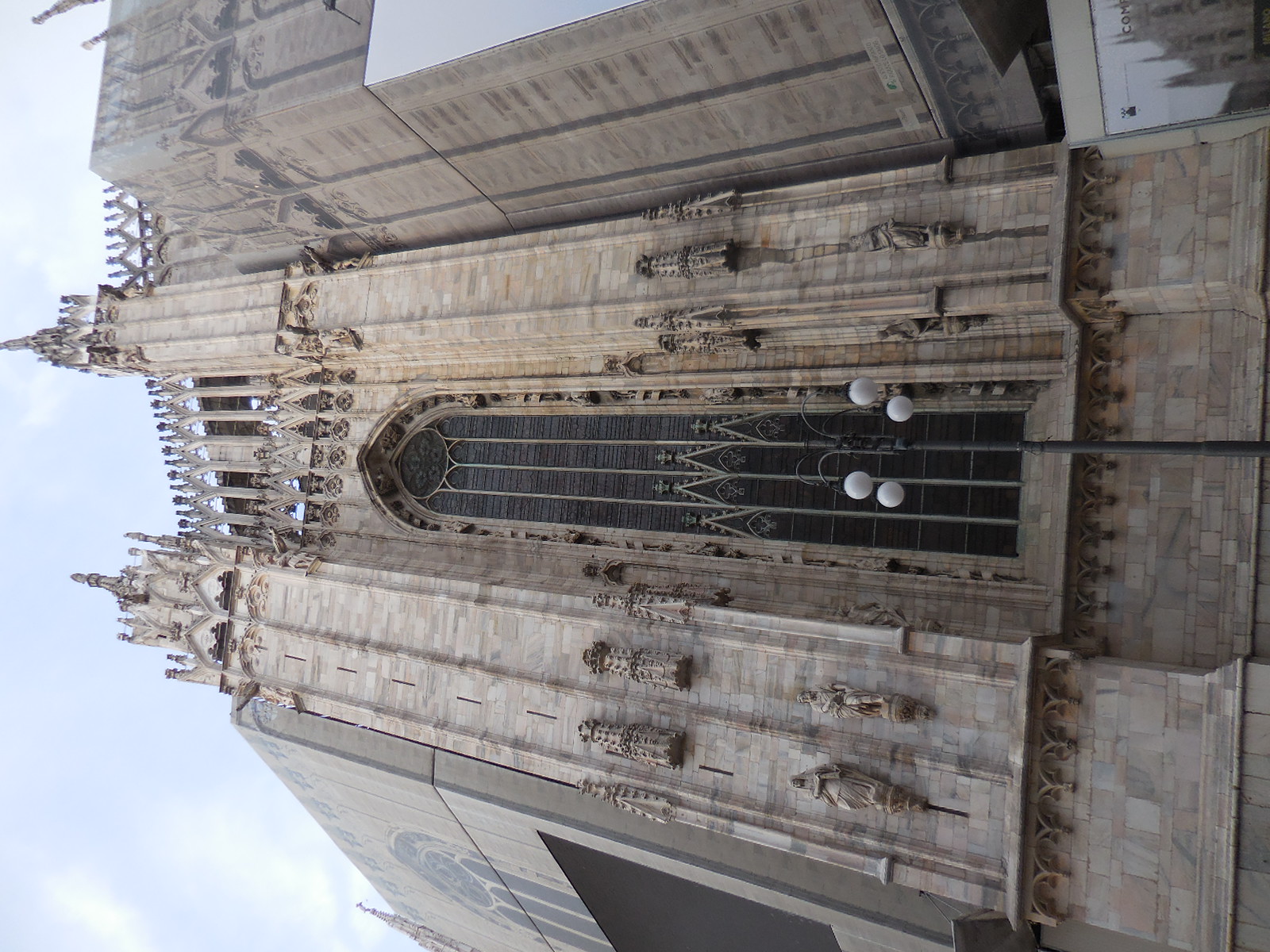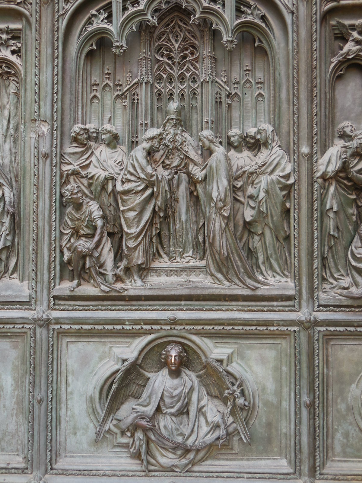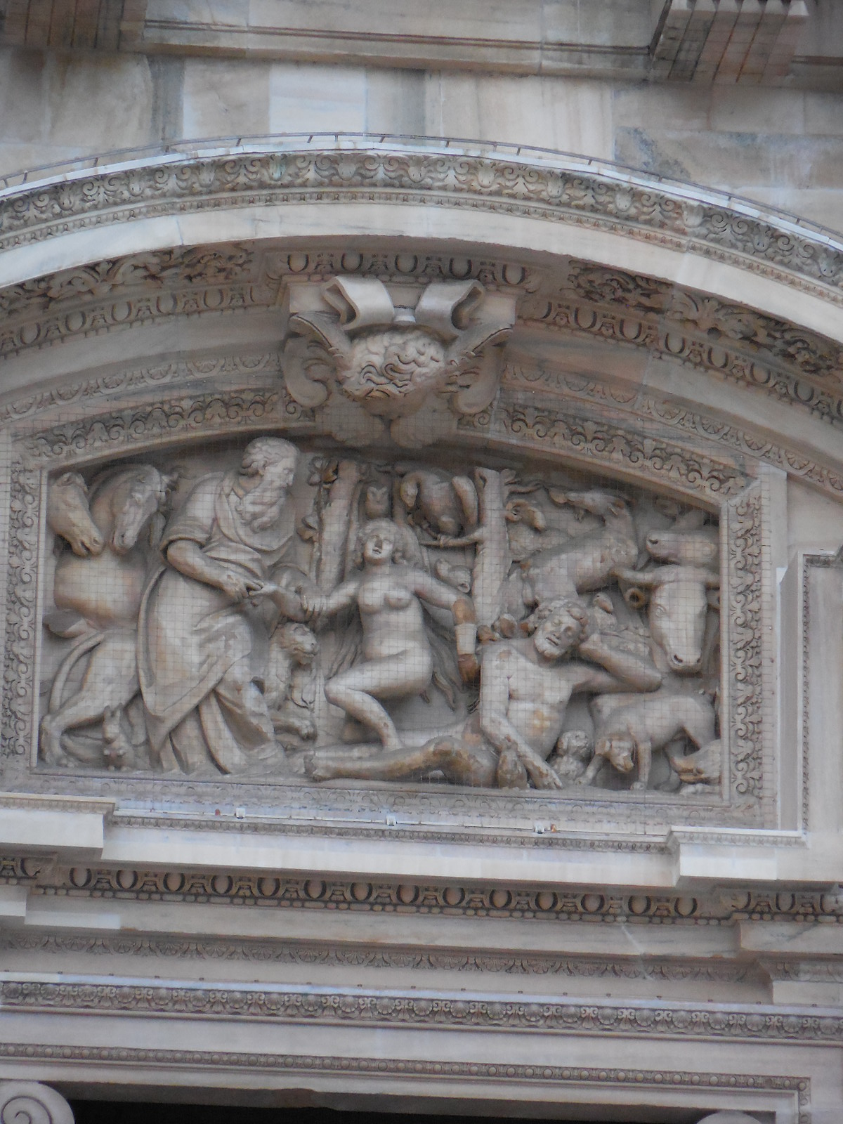 Because the cathedral was not yet open, I was able to study its closed bronze doors. One showed the history of life of Mary with floral reliefs. Another depicted the history of Milan and yet another the history of the cathedral itself. The reliefs on the doors were incredible. I saw the Assumption, the Sacrifice of Cain, David with the Head of Goliath, the Tower of Babel and other biblical pictorial renditions. The floral and animal decoration on the central door was outstanding, too. The tympanium was worth noting, too. The one in the central portal showed off the Creation of Eve.