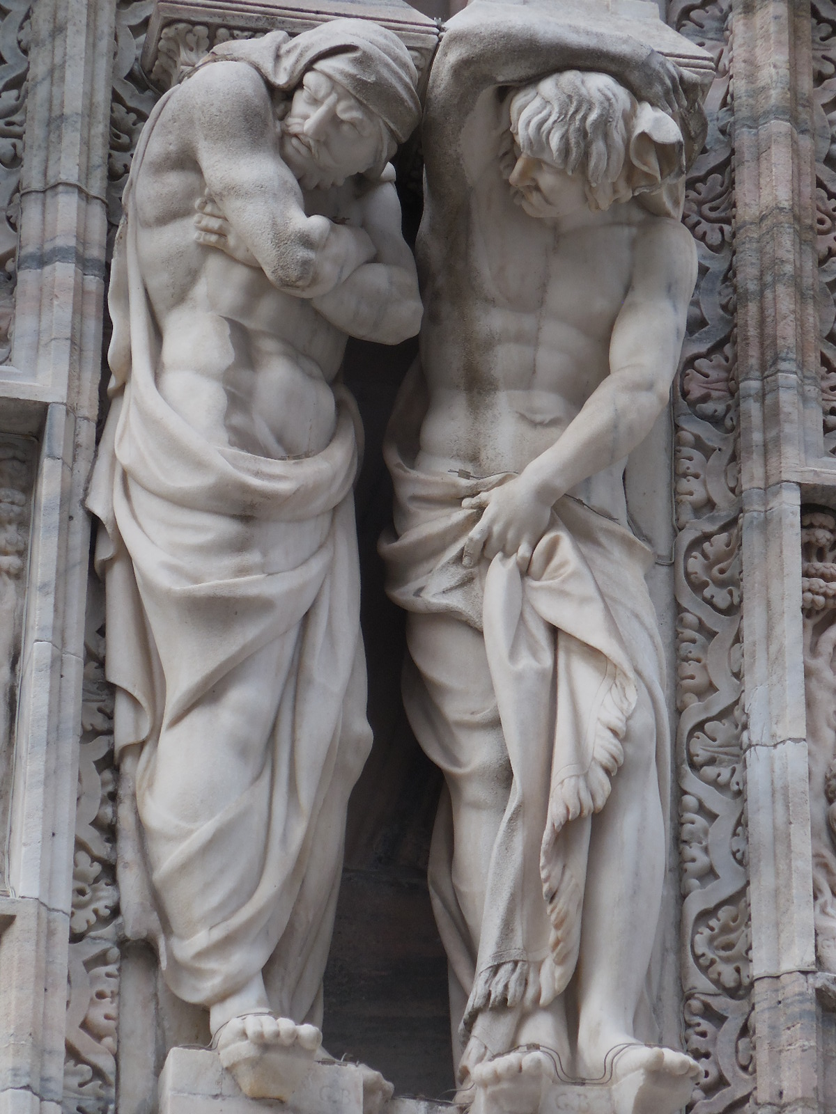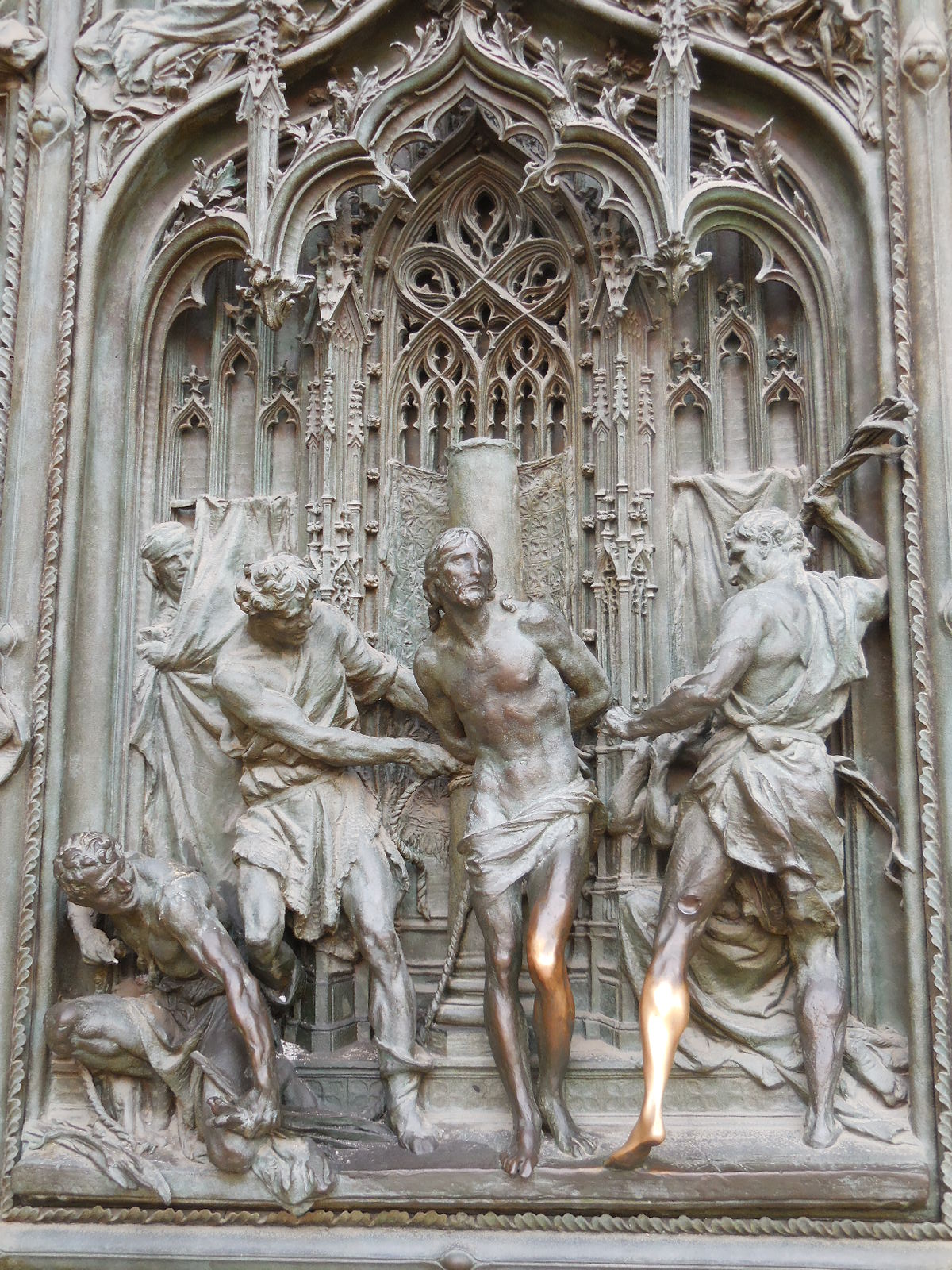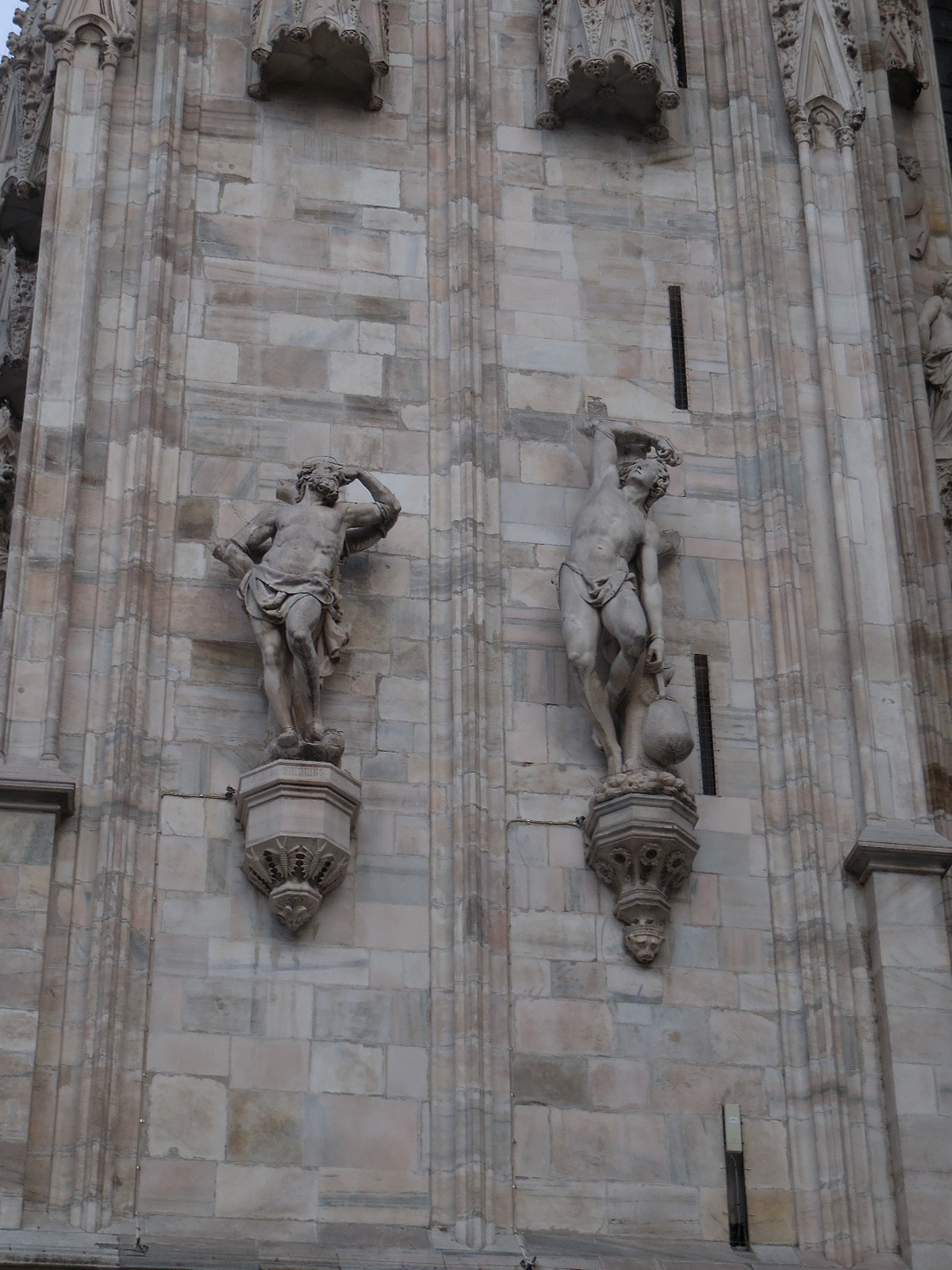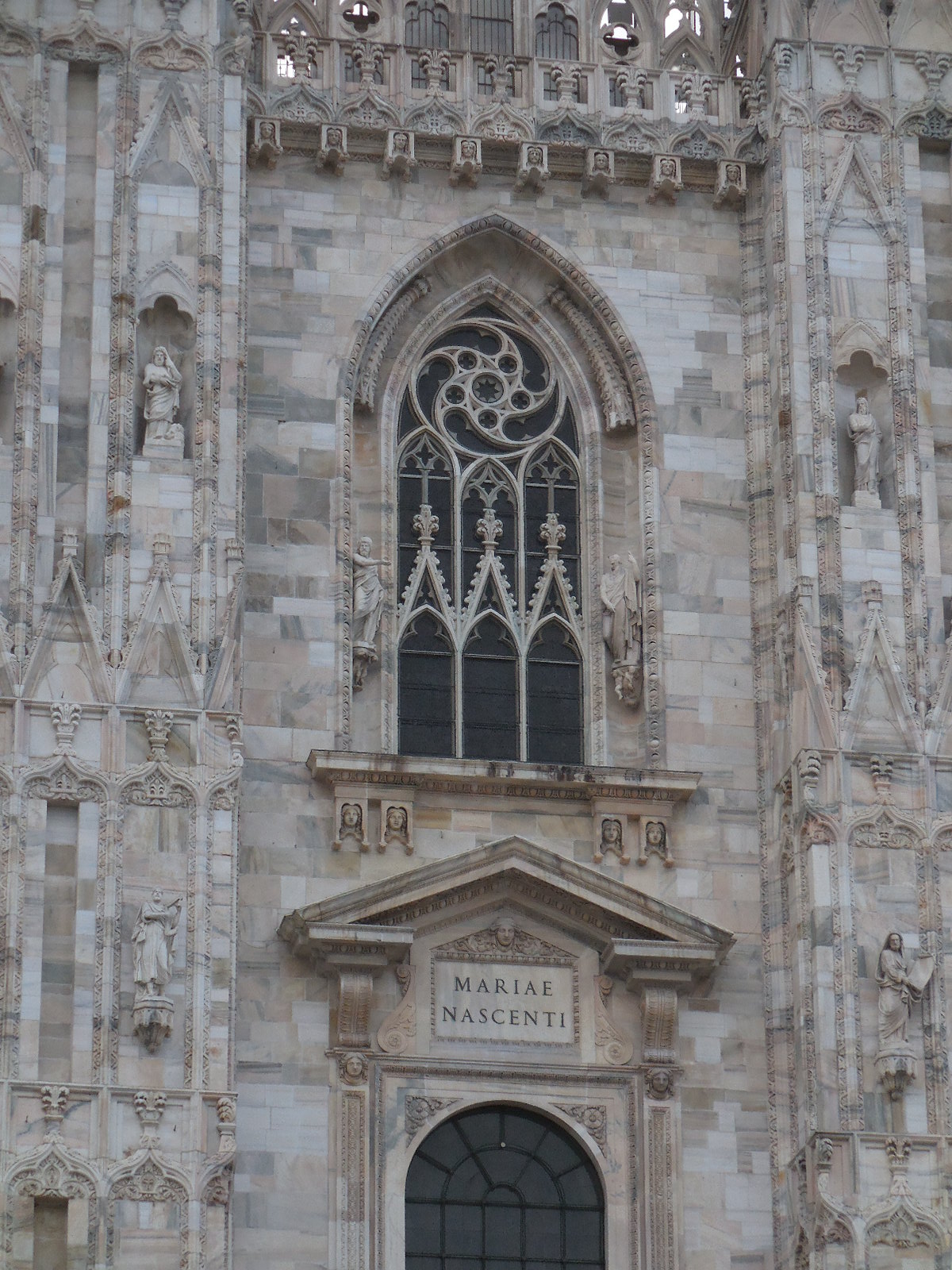 Because the cathedral was not yet open, I was able to study its closed bronze doors. One showed the history of life of Mary with floral reliefs. Another depicted the history of Milan and yet another the history of the cathedral itself. The reliefs on the doors were incredible. I saw the Assumption, the Sacrifice of Cain, David with the Head of Goliath, the Tower of Babel and other biblical pictorial renditions. The floral and animal decoration on the central door was outstanding, too. The tympanium was worth noting, too. The one in the central portal showed off the Creation of Eve.