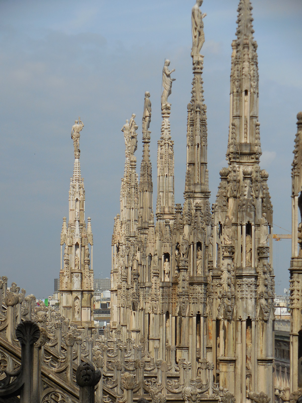 Later that morning, I walked on the sloping terraces of the roof with its pinnacles and spires on flying buttresses. Gazing at the sheer beauty of the cathedral’s exterior from high up was astounding. I spotted the octagonal lantern from the 15th century with its Madonnina statue from 1769. The Madonnina reaches more than four meters high. The total height of the cathedral is 108.5 meters. The view of the city and spires was phenomenal. It was calming and soothing seeing all the people so far below. Up there I didn’t have a reason to rush or worry. It made me think of how we have to open ourselves to new perspectives when traveling. This applies in daily life as well. Whenever I had a pessimistic attitude, I had to try to see the problem from a fresh perspective that would give me a more positive outlook.