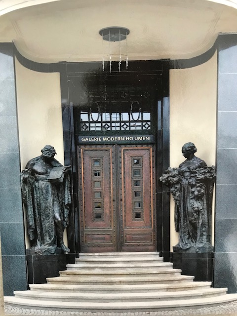 First, about the building housing the Gallery of Modern Art: Like many edifices in Hradec Králové, the museum is an architectural gem. Facing the town’s main square, the building that was completed in 1912 by Osvald Polívka is impressive with two statues flanking the façade. These sculptures were made by Ladislav Šaloun in 1908 and show allegories of commerce and the harvest. Reliefs of atlases with dogs at their feet also make up the external ornamentation. Polívka’s Art Nouveau designs can be found in Prague’s Municipal House, which he decorated from 1905 to 1912. I tell everyone coming to Prague to tour the Art Nouveau Municipal House, as it is certain to be a highlight of any visit. Šaloun created the statue of Jan Hus that dominates Prague’s Old Town Square.