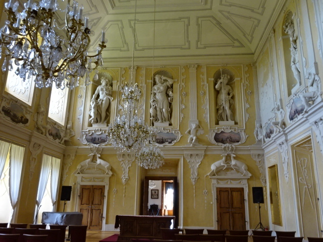 Because the interior had been recently renovated, I returned to Dobříš Chateau not far from Prague. I was disappointed there were not as many rooms decorated with period furniture. Instead, the self-guided tour mostly featured spaces celebrating the Colloredo-Mansfield family’s accomplishments, which were very intriguing and noteworthy, to be sure. Still, I missed the longer, guided tour and former exciting interior décor of the Rococo and Classicist eras. The Writers’ Room remained on display, decorated the way the space would have looked when the chateau belonged to the Writers’ Union from the 1950s to the 1990s. It was possible to enter one side of the spectacular Hall of Mirrors, although it was roped off and walking through the room was not permitted. The fresco-filled hall amazed with 18th century décor and eight Venetian chandeliers as well as monumental fireplaces.