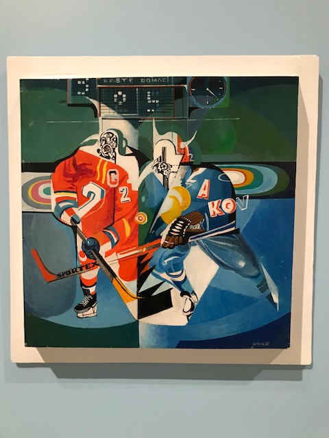Then hockey became the major theme, first portrayed realistically and then in the 1960s expressed in an experimental fashion. I was drawn to František Tavík Šimon’s “Ice Rink Under the Charles Bridge” (1917) with its large falling snowflakes and idyllic, historical setting. One example of the experimentation of the 1960s is Vojtěch Tittlebach’s “Hockey” from 1965, with abstract shapes and simple forms. The players in this painting had no facial traits. Jiří Kolář also added to the experimentation of the 1960s with his “Hockey Sticks,” composed of three wooden sticks decorated with paper collages, many of them maps and some historical scenes. The 1998 Czech Olympic victory at Nagano was celebrated in large photographs, including one that showed the moment Czech Petr Svoboda scored the winning goal while the crowd in Old Town Square erupted in joy.