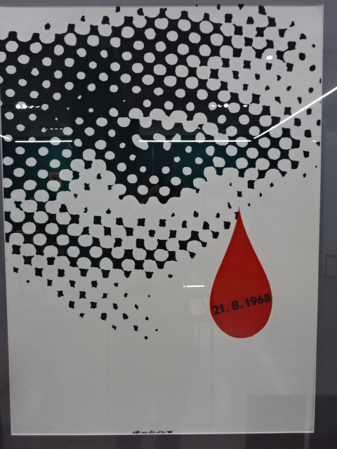 In Prague I took advantage of the stunning exhibitions this past year. I went to two excellent shows at Kampa Museum. One featured Czech graphic art from the founding of Czechoslovakia in 1918 to the present. I saw the first star-studded designs for the Czechoslovak flag as well as many political posters from the World War II era through Communist times to the Velvet Revolution of 1989. Václav Ševčík made a poster focusing on the day of invasion of the Warsaw Pact armies into Czechoslovakia on August 21, 1968, when the country’s liberal reforms were squashed. The poster shows a blood-red tear below an eye outlined in black on a white background.