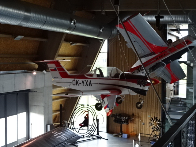 Construction on the museum in a hangar of the Mladá Boleslav airport finished in 2014, and it had been open to the public since 2015. The architecture received much acclaim as it was chosen one of five buildings in the country to be dubbed “Construction of the Year” for 2014. The museum also included two plane simulators and a gyroscope. I perused period uniforms, radio equipment, watches, photography, aviation trophies and posters. From an observation tower there were excellent views of the environs. After walking up steep stairs to the first floor of the museum, I got a good look at the planes hanging from the ceiling.