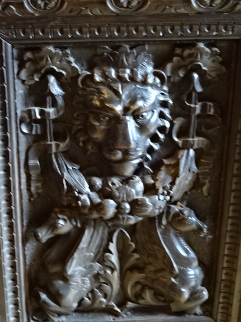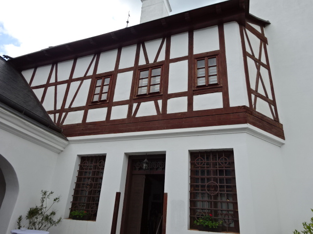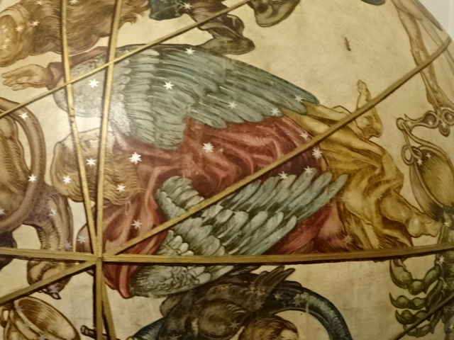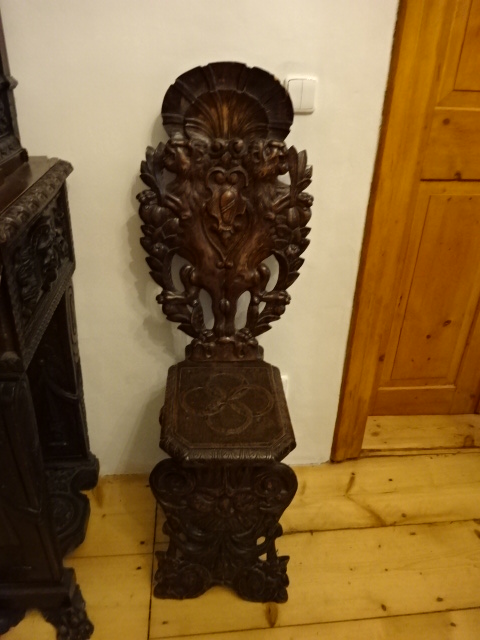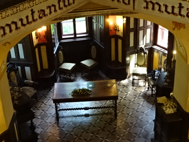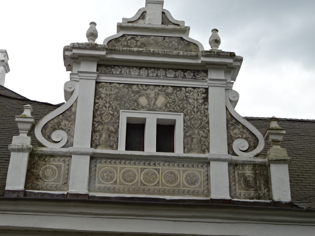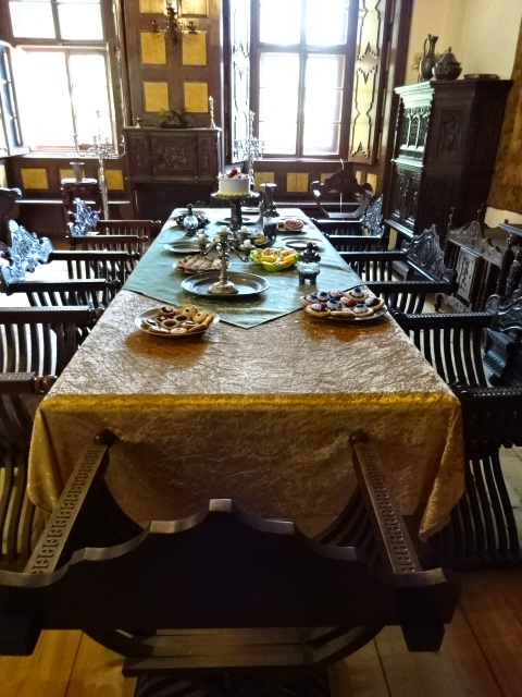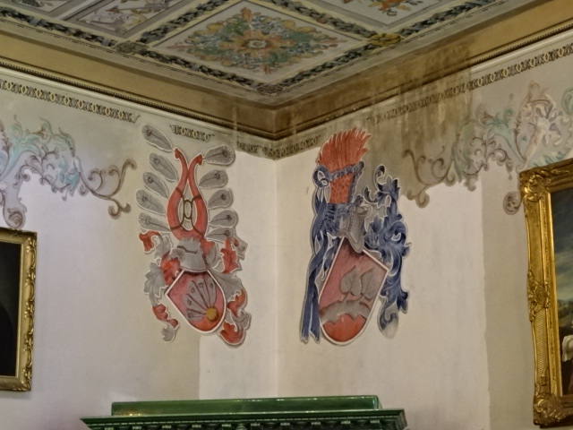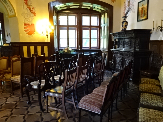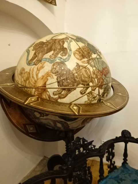 In the bedroom that we entered first, I was intriguing by the Baroque bed with exquisite carving. In the dining room, I was speechless at the sight of low Renaissance chairs around a Renaissance table. In other rooms, I saw many Gothic chairs, often Romanticized into 19th century style. A Mannerist cabinet with exquisite woodwork of figures and columns was a delight in one space. I spotted a portrait of Rudolf II among the pictures of rulers that decorated a high wall in the bedroom. I also saw in one space a 18th century globe decorated with allegorical figures of zodiac signs instead of continents. The ceiling decoration of a green-and-white pattern in the bedroom also awed me. So delicate and so much attention to detail.