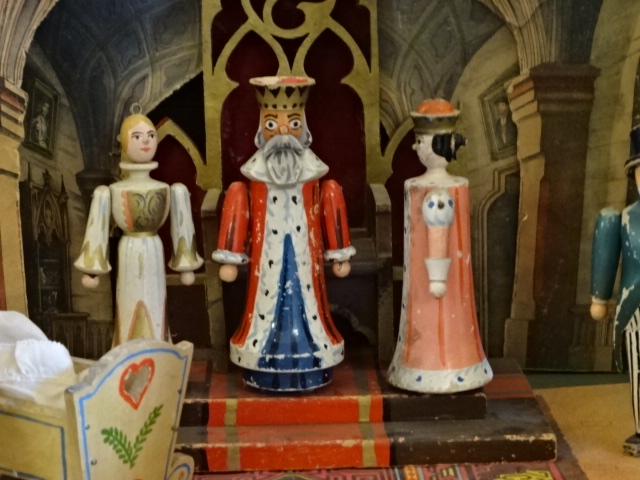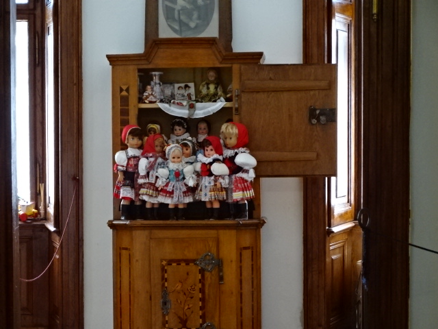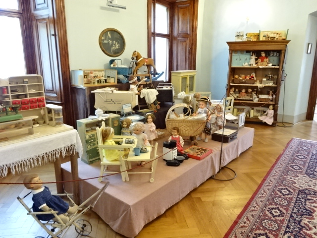 The chateau included a toy museum with old objects donated by a private collector. I saw early 20th century dolls of girls in folk costumes and once much loved teddy bears of various sizes. Children’s baby carriages and dolls of various sizes graced the exhibition room. A rocking horse was also on display. I loved the miniature furniture, such as a cabinet filled with plates and tea cups. I also peered in one hallway at original folk costumes, exquisitely made.