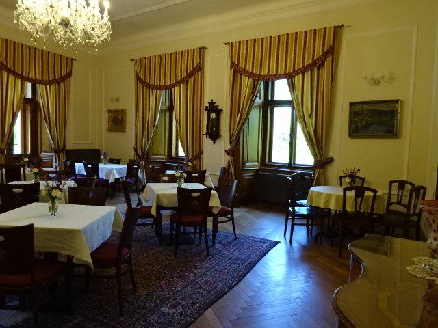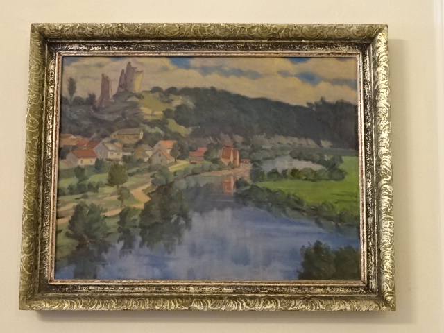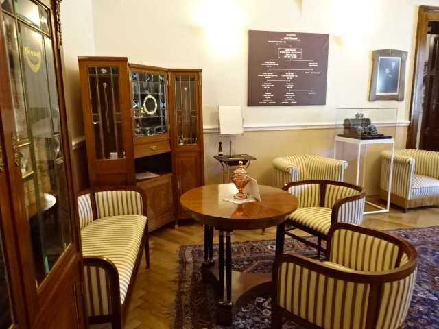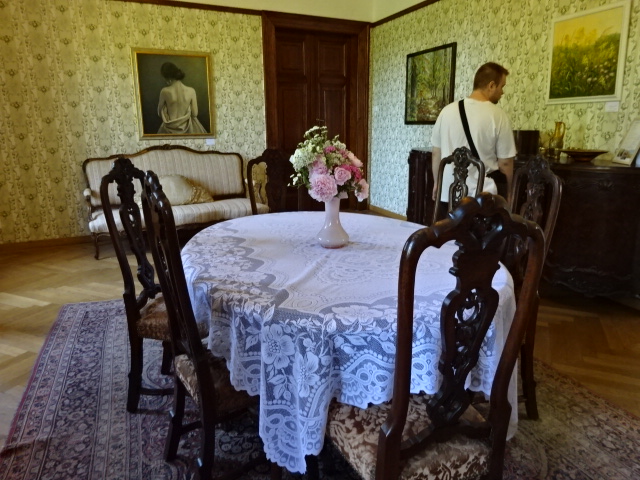 The interior was cozy with an atmosphere that made me want to open a good book and relax there. In one room with wine red-upholstered chairs and a table with a tea service, I could imagine having a cup of Earl Grey on a wintry evening while discussing the Čapeks’ latest play. I could imagine people seated in armchairs or at tables there, talking animatedly about what was new with Masaryk’s politics, Karel Čapek’s books and Josef Čapek’s artwork. While some of the paintings on the wall were for sale, others harkened back to past eras. The dining room chairs looked elegant with the family coat-of-arms decorating the backs. A beautiful piano also was on display.