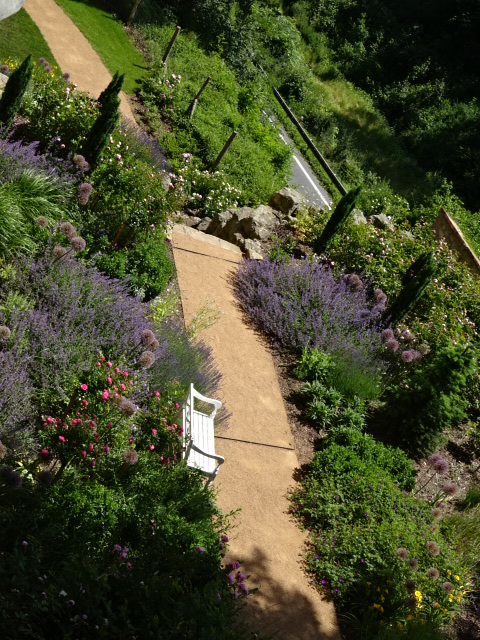 I walked into the café/box office to buy my ticket. The room was quaint with dark paneling. Then I walked into the courtyard dotted with white tables and chairs, and I gazed at the elegant Neo-Renaissance arcades. A distinctive sandstone fountain also caught my attention. From the courtyard I could see a narrow garden area below. People were seated at the white chairs and small tables in the garden. The plant species and flowers were colorful and enthralling.