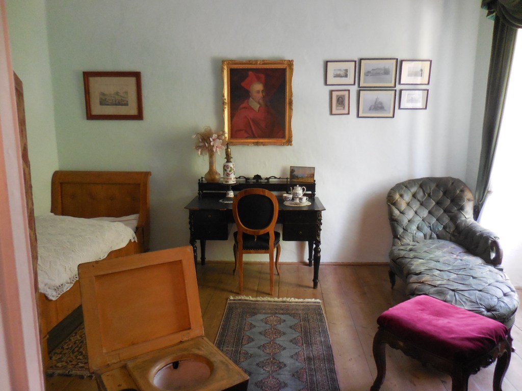 The chateau was transformed into Baroque style during 1776 and now has a Classicist appearance. After World War II, it was nationalized, and the Forest Institute took control. In 1948 the town took over, and the chateau served various functions. At one time, it included a movie theatre, library and Socialist Youth Union club. There had been apartments here, too. Later the Museum of Josef Dobrovský opened on the site, named after the historian because he had spent some time there. We even saw the bedroom where Dobrovský had slept. In 2009 the Černín family moved back to Chudenice and now live in the other chateau in the town, the Empire style Lázeň, which they are reconstructing along with its English park. The guide said the Černíns often visit Chudenice Chateau and even give private tours on weekends.