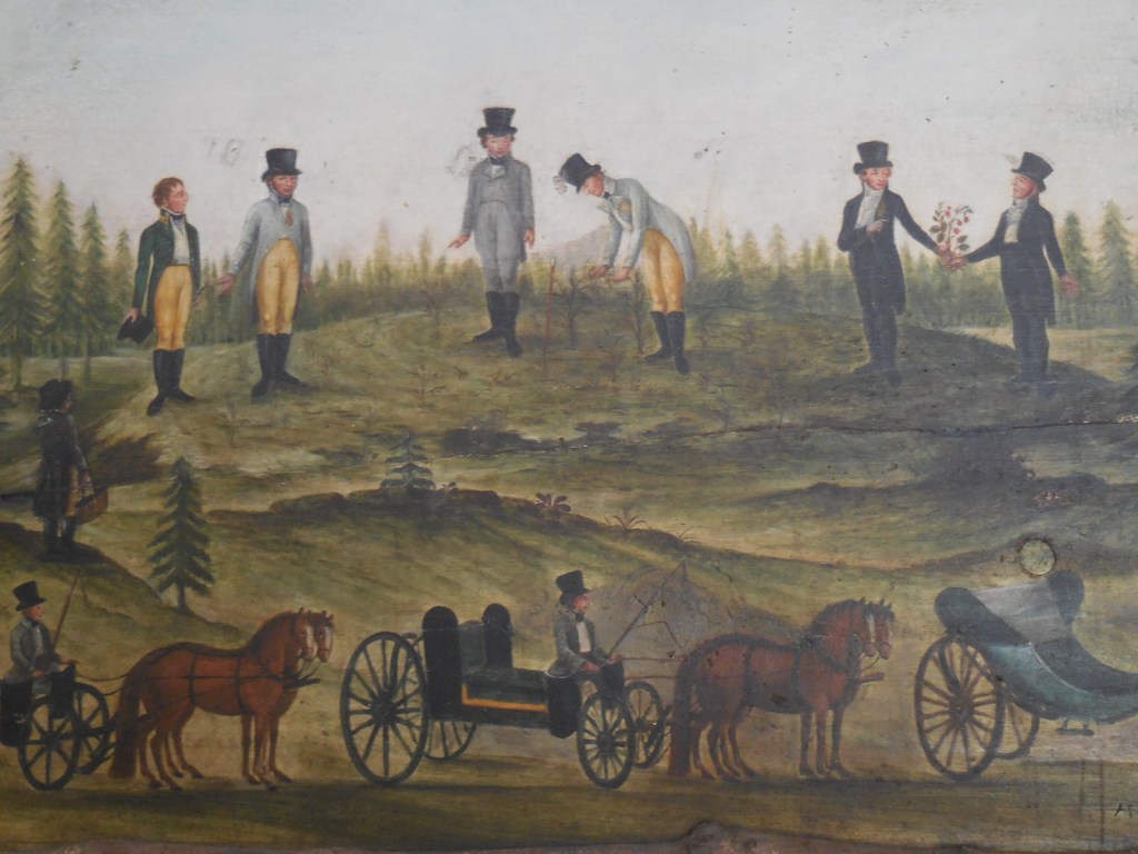 Now there is a fresco of a red-clad angel with silver wings on the arched ceiling. I also liked the part of another ceiling that was painted in Art Nouveau style. The porcelain in the Oriental Salon was exquisite. An Empire clock stood out as well. The Hunting Salon showcased paintings of dogs and a green tiled stove plus trophies from forests near Chudenice. There were noteworthy paintings and graphic works on display, too. A blue porcelain peacock was impressive. Some unique chandeliers were exquisite, and one Classicist tiled stove captured my attention. Old shooting targets were painted with intriguing bullet-ridden scenes. Still, I would occasionally notice that a piece of furniture needed to be repaired– for example, the upholstery of some chairs was in need of restoration. The chateau just didn’t have the finances at this point.