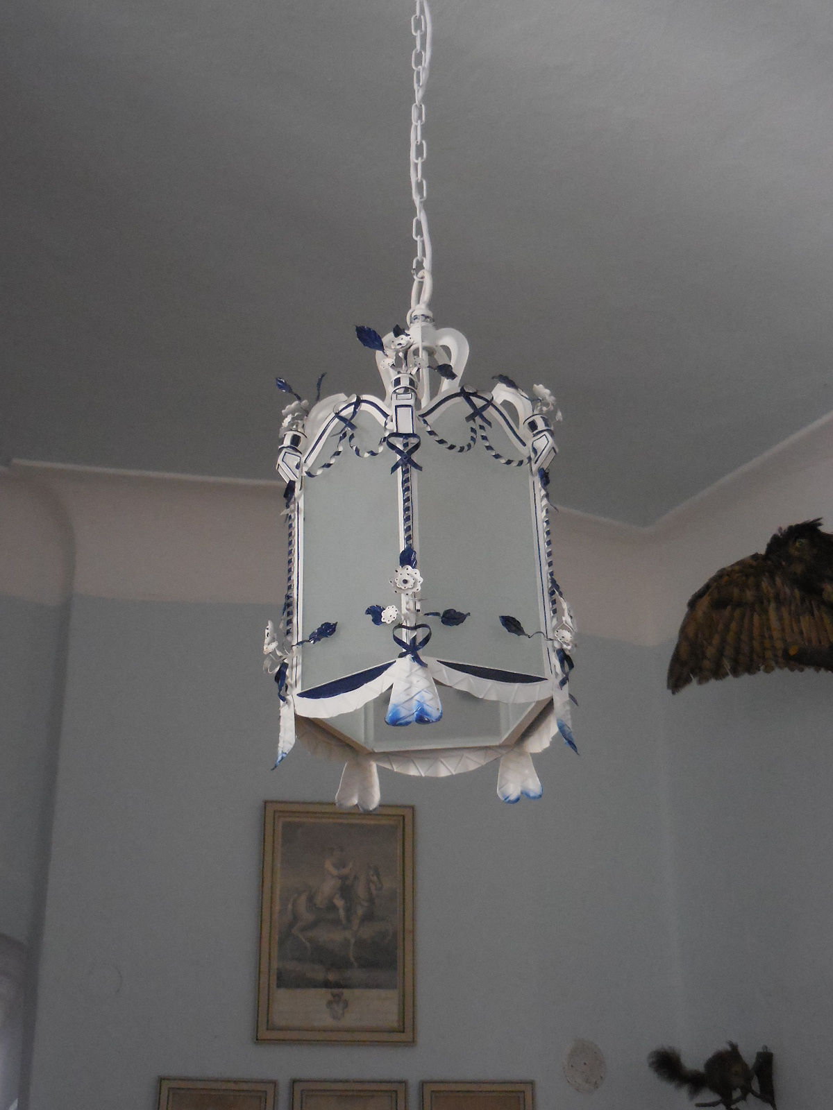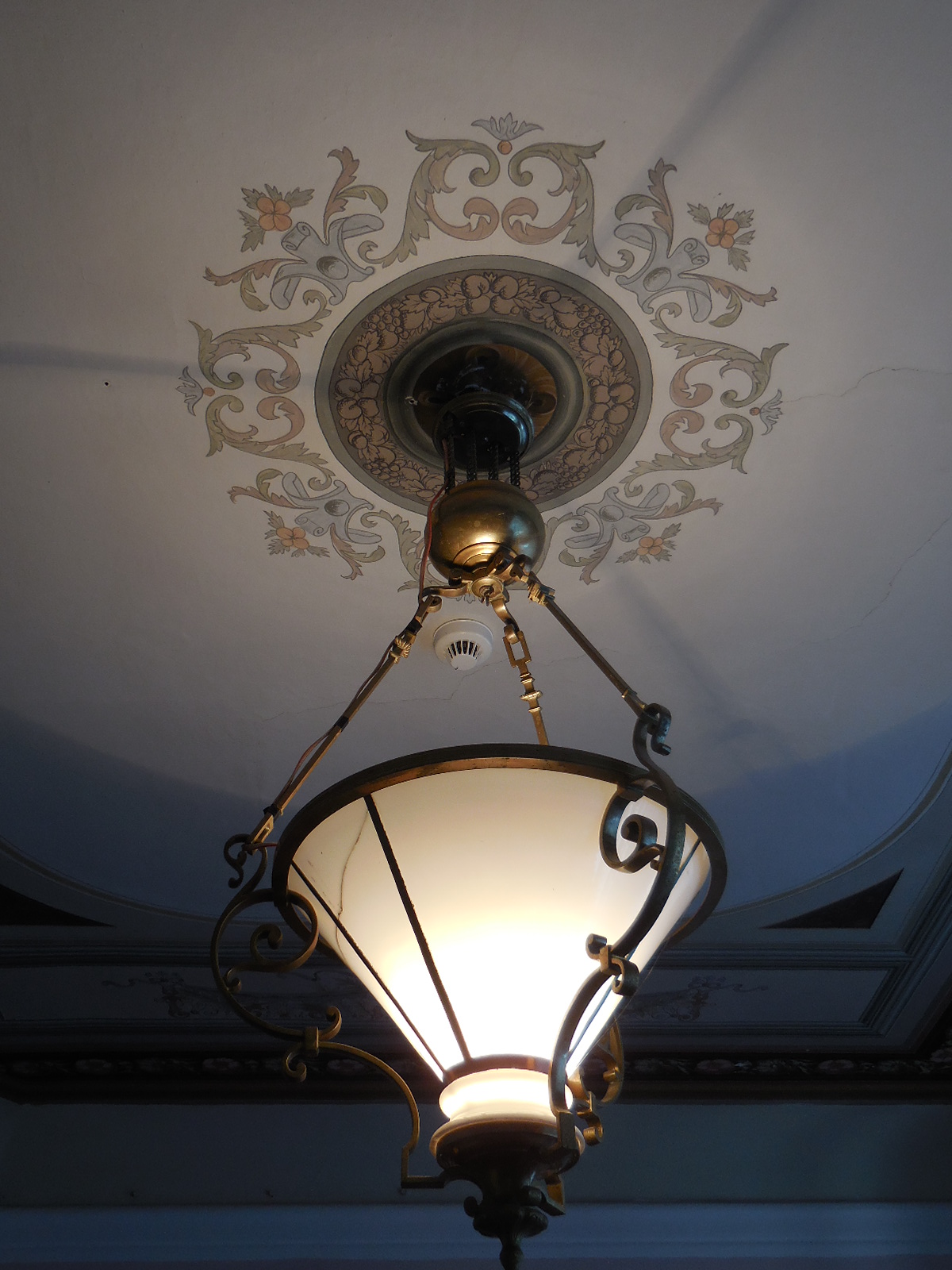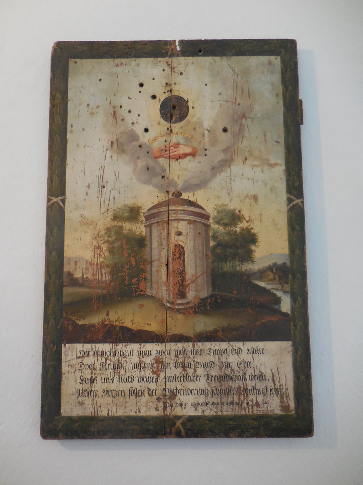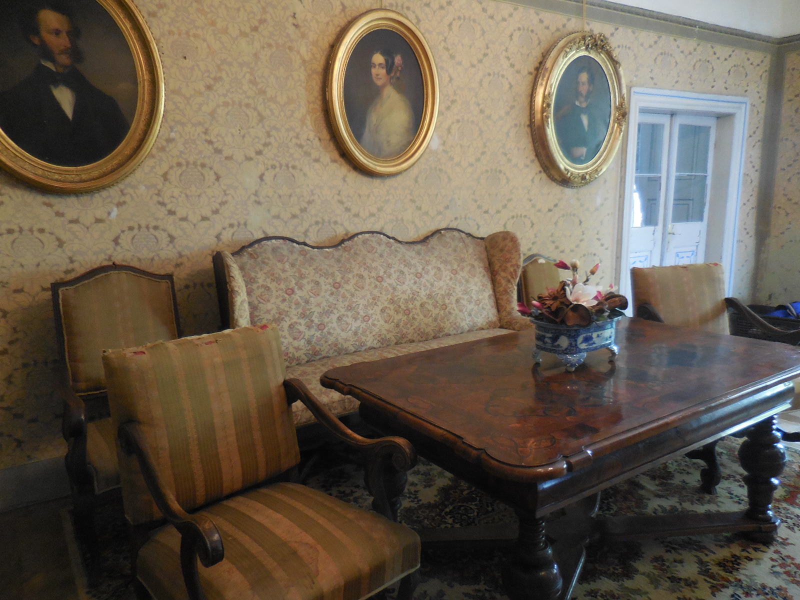 Now there is a fresco of a red-clad angel with silver wings on the arched ceiling. I also liked the part of another ceiling that was painted in Art Nouveau style. The porcelain in the Oriental Salon was exquisite. An Empire clock stood out as well. The Hunting Salon showcased paintings of dogs and a green tiled stove plus trophies from forests near Chudenice. There were noteworthy paintings and graphic works on display, too. A blue porcelain peacock was impressive. Some unique chandeliers were exquisite, and one Classicist tiled stove captured my attention. Old shooting targets were painted with intriguing bullet-ridden scenes. Still, I would occasionally notice that a piece of furniture needed to be repaired– for example, the upholstery of some chairs was in need of restoration. The chateau just didn’t have the finances at this point.