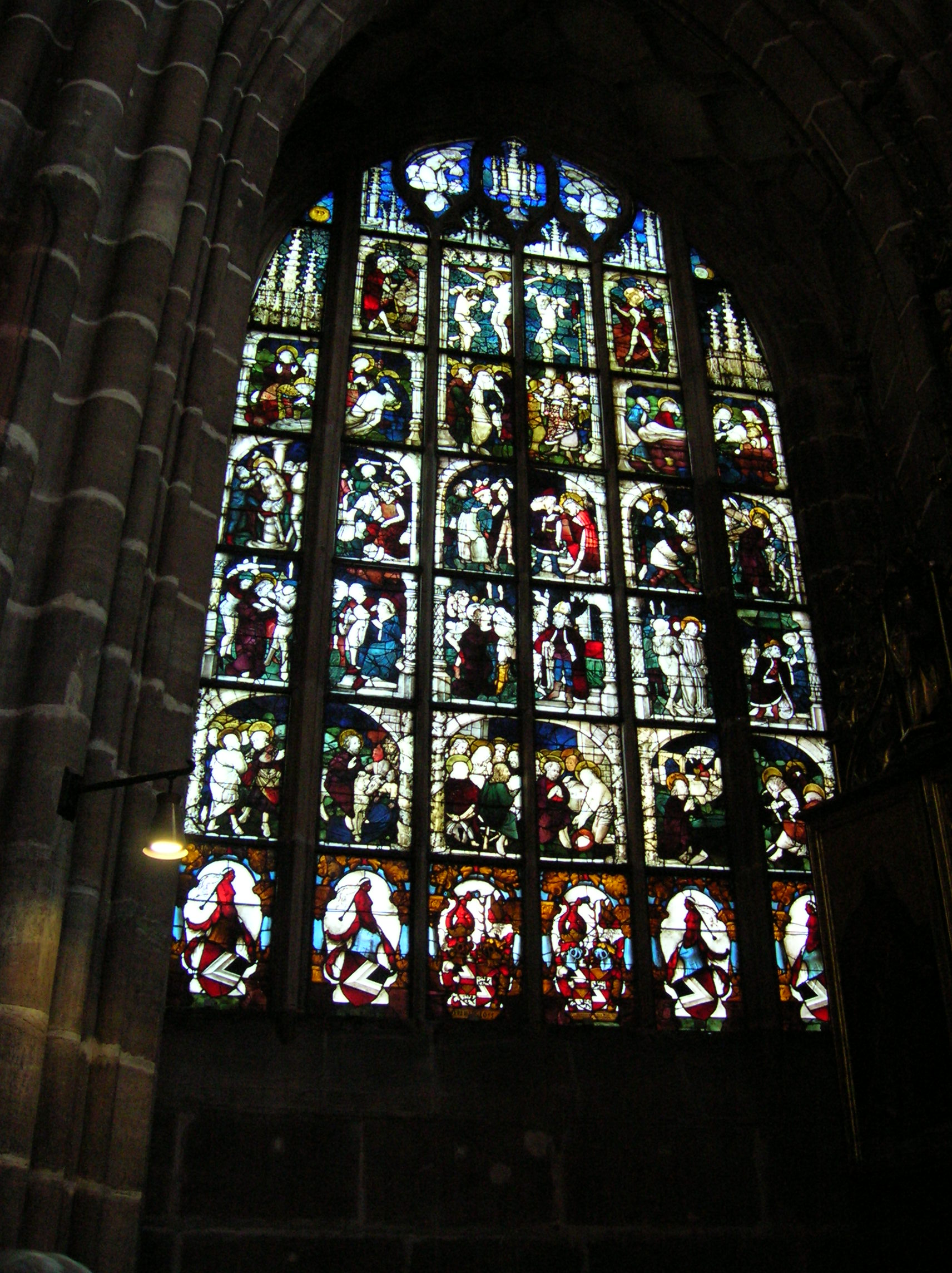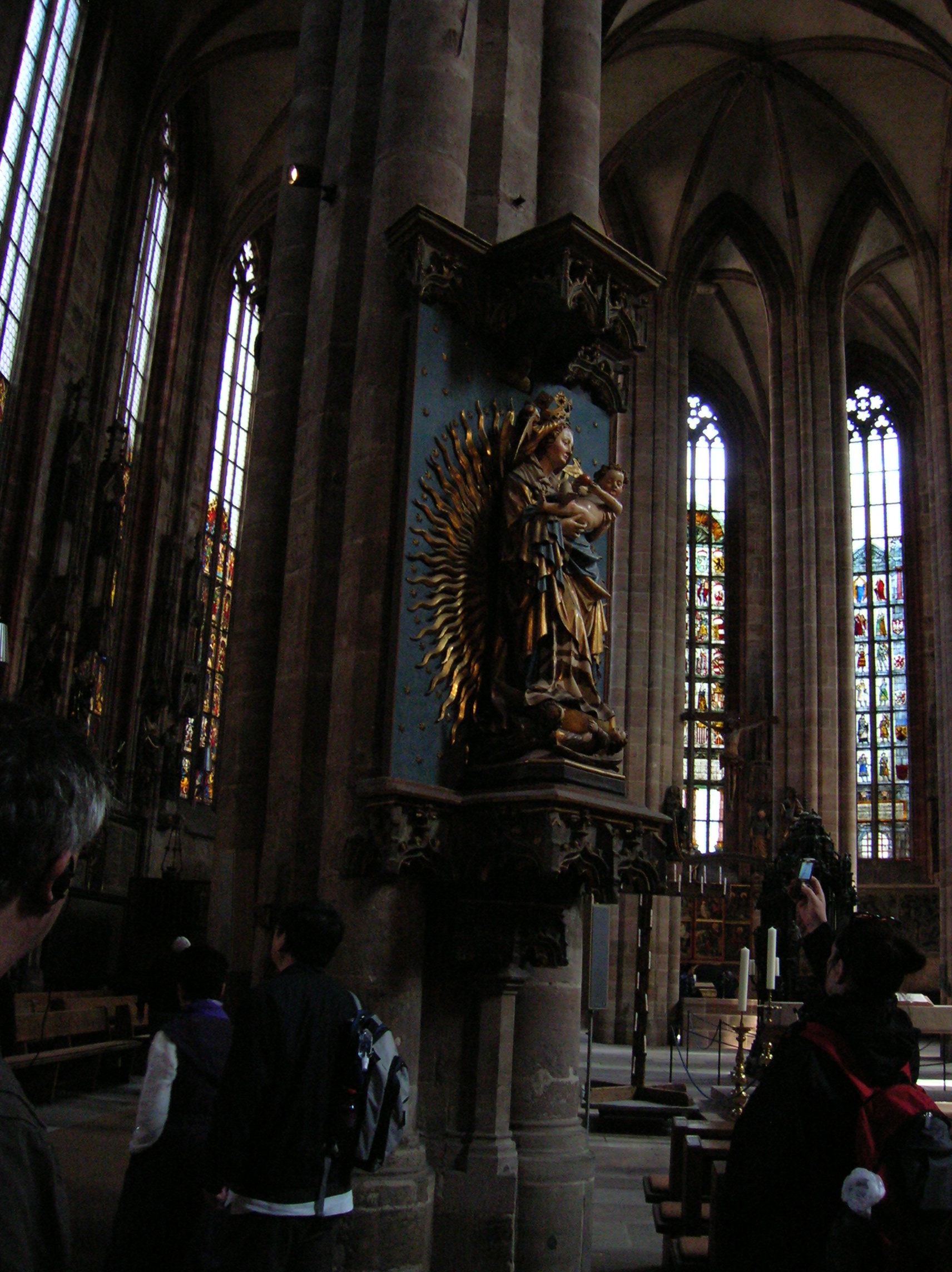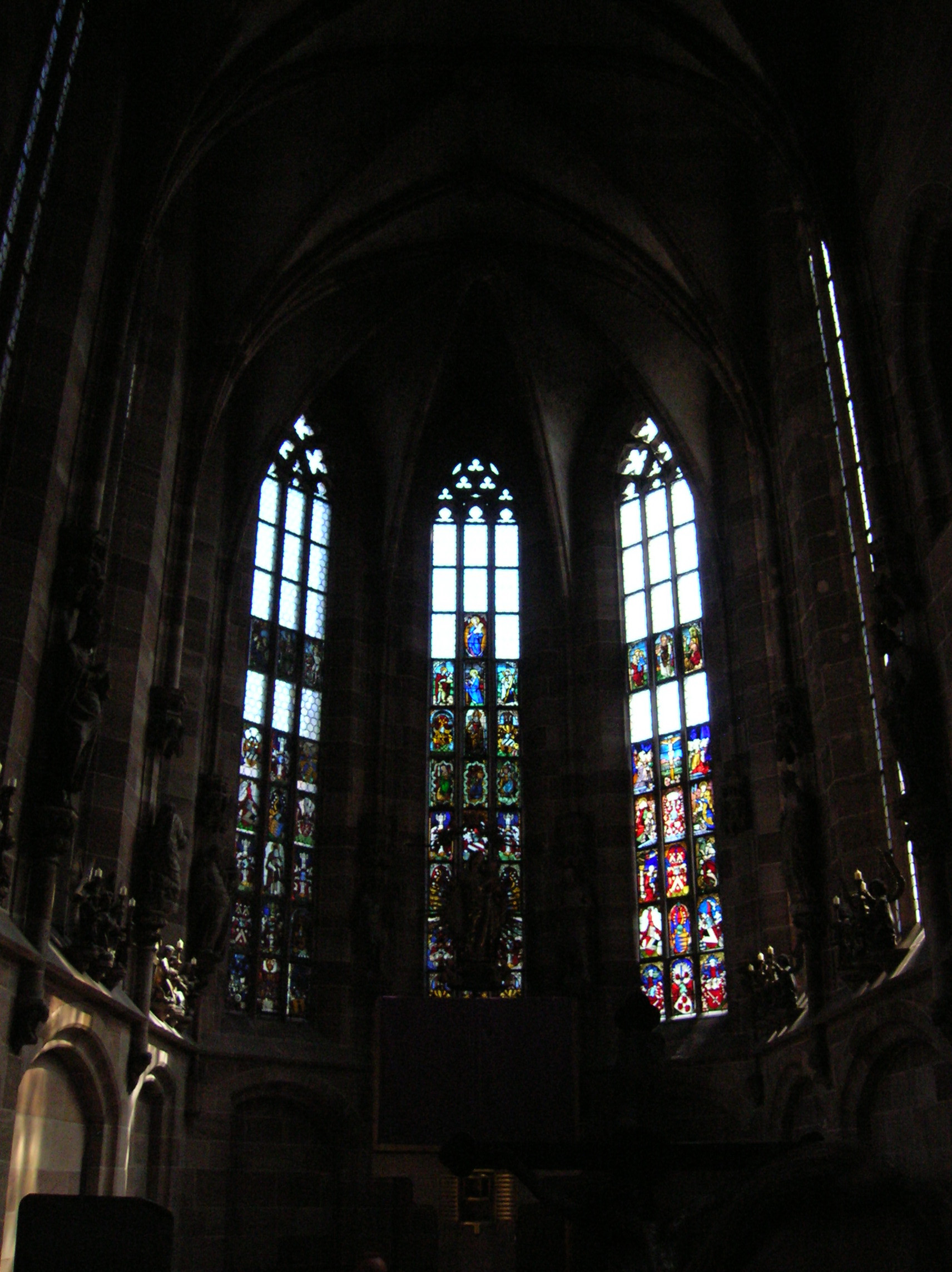 Upon entering the cathedral, I was instantly transported back to the Middle Ages. It was dark and gloomy except for the light that the stained glass windows let in, giving the cathedral an airy quality. Made from 1300 to 1370, the windows had a mystical aura. I felt as if the light cleansed me spiritually, as if it cleansed my soul. I was so entranced. I could not believe I was looking at original Gothic stained glass. I had read that one window portrayed scenes from Christ’s childhood while another showed scenes from the lives of St. Peter and St. Paul. Pictures of saints decorated the windows, too. Some of the stained glass came from the original cathedral that had burned down. That part was in Romanesque style, dating from 1230.