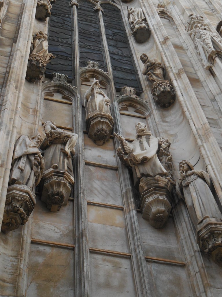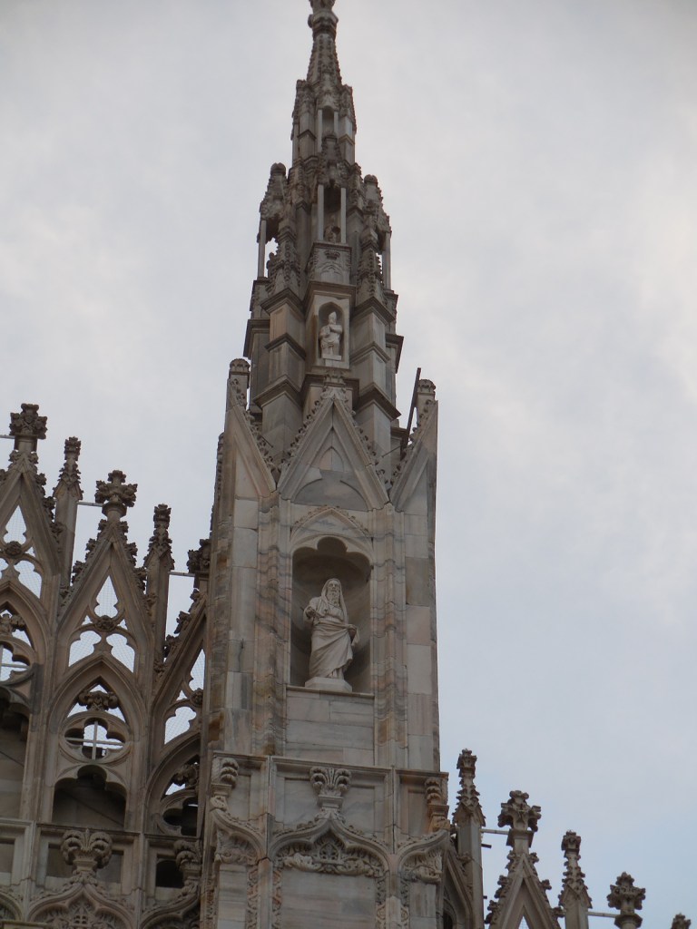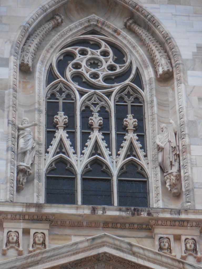 When I arrived at the Duomo in Milan with my camera, it was about six am. I hadn’t been able to sleep because I was so anxious about my exciting itinerary for my first full day in the city. The large square was almost empty, though an occasional jogger passed through. I spent at least an hour walking around the cathedral, gazing at the exterior decoration – the spires, the large windows, the flying buttresses, the rich sculptural adornment, the gargoyles and more.
