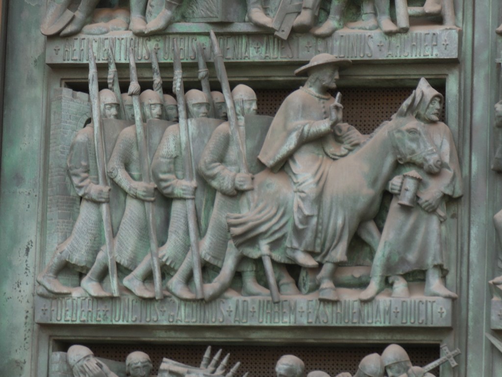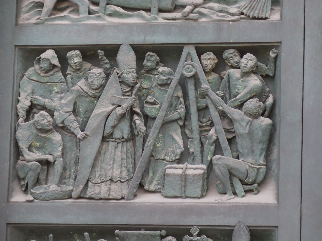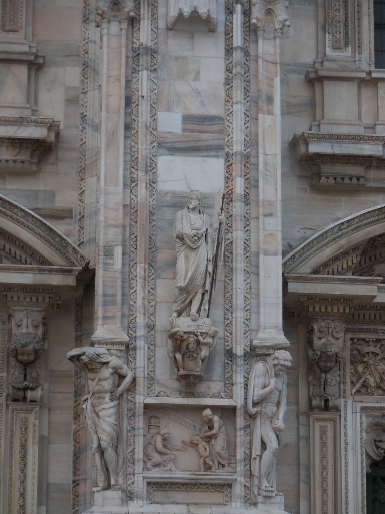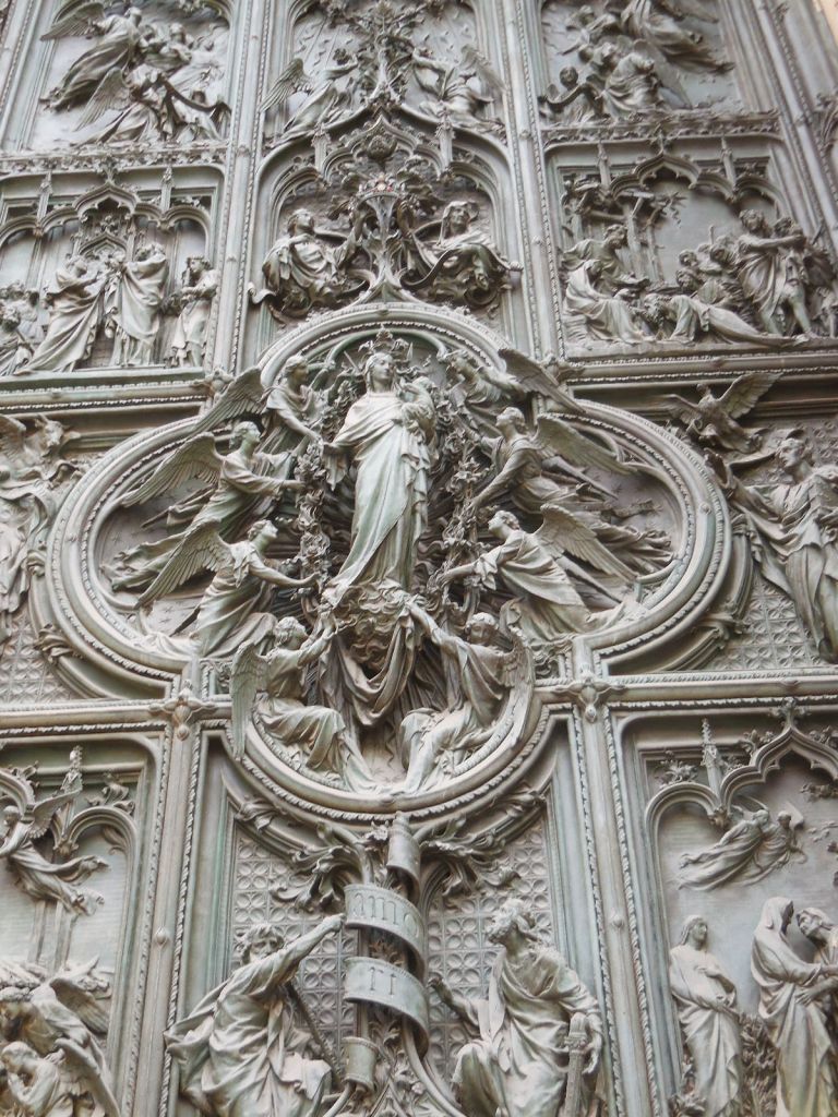Because the cathedral was not yet open, I was able to study its closed bronze doors. One showed the history of life of Mary with floral reliefs. Another depicted the history of Milan and yet another the history of the cathedral itself. The reliefs on the doors were incredible. I saw the Assumption, the Sacrifice of Cain, David with the Head of Goliath, the Tower of Babel and other biblical pictorial renditions. The floral and animal decoration on the central door was outstanding, too. The tympanium was worth noting, too. The one in the central portal showed off the Creation of Eve.